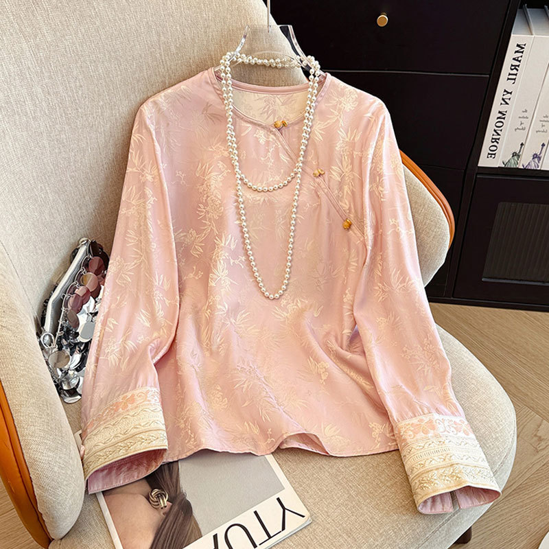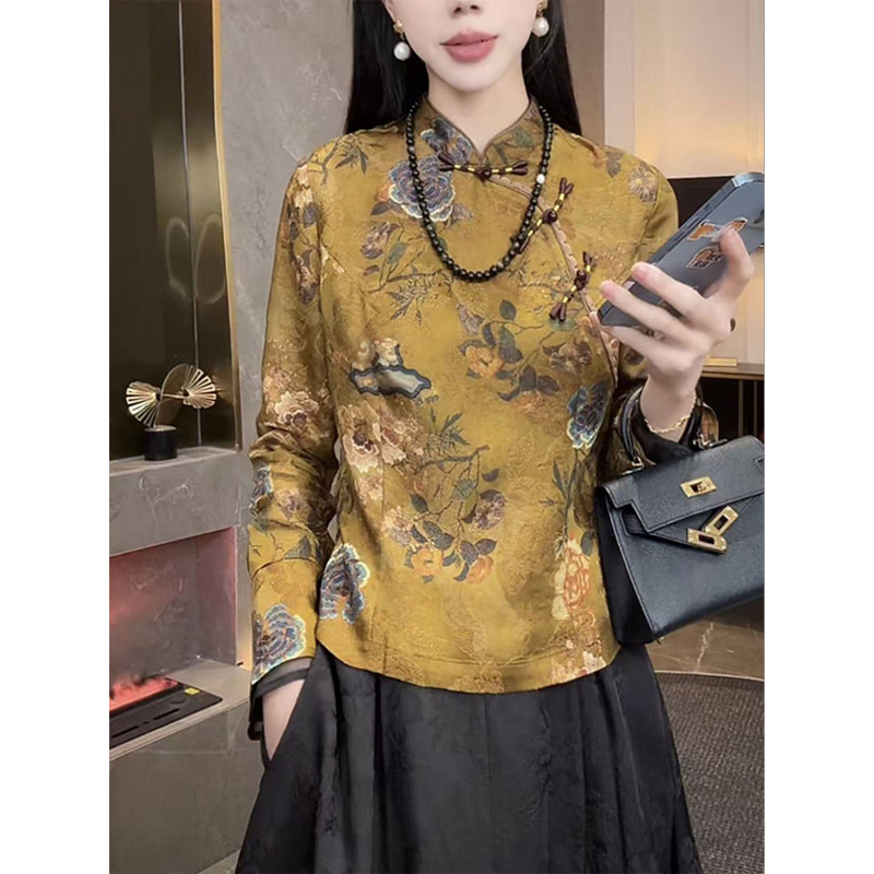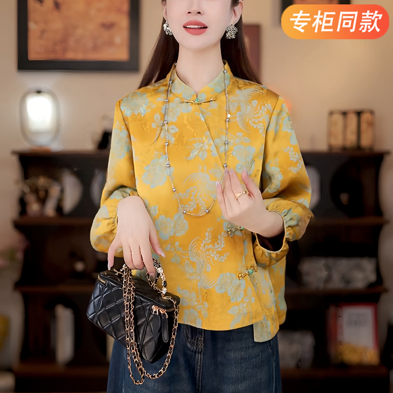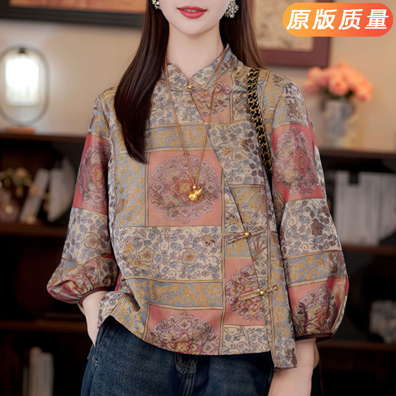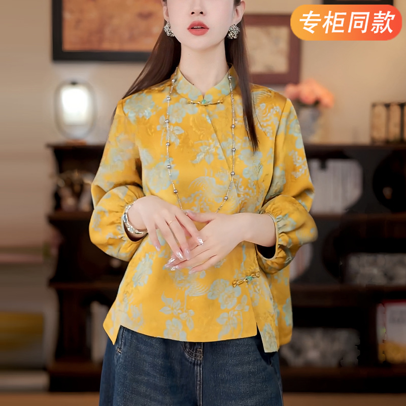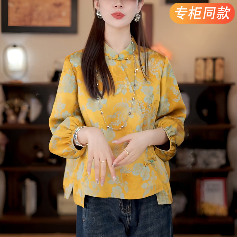 2025秋装新中式国风改良旗袍立领盘扣提花衬衫女洋气唐装小衫上衣