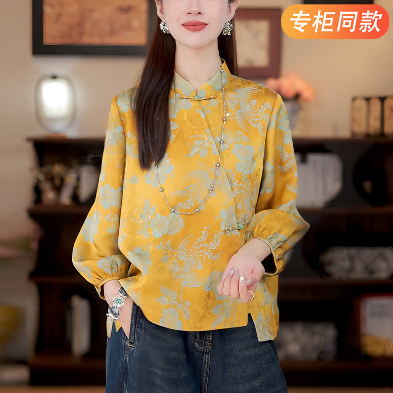 黄色新中式真丝衬衫唐装中国风女装衬衣春秋新款七分袖桑蚕丝上衣
