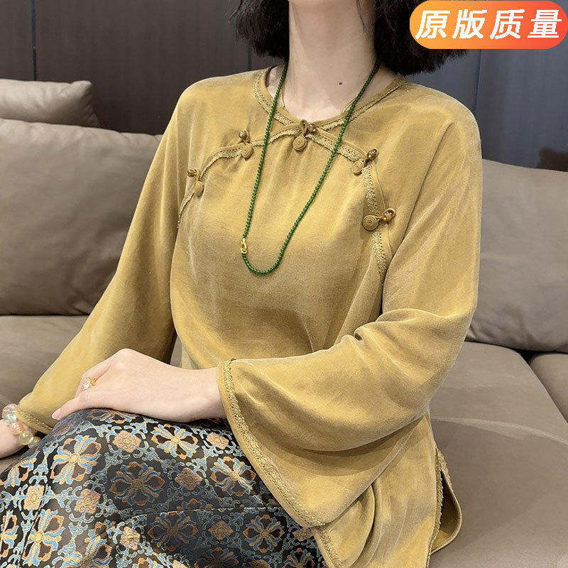 丝绒国风上衣年轻款改良旗袍长袖小衫圆领刺绣盘扣新中式衬衫女秋