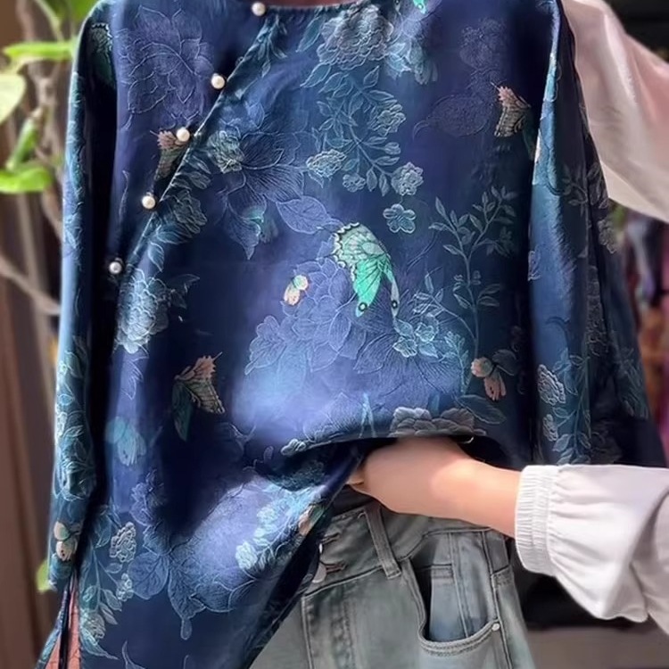 2025早秋新中式国风蓝色真丝蝶恋花圆领衬衫女洋气唐装七分袖上衣