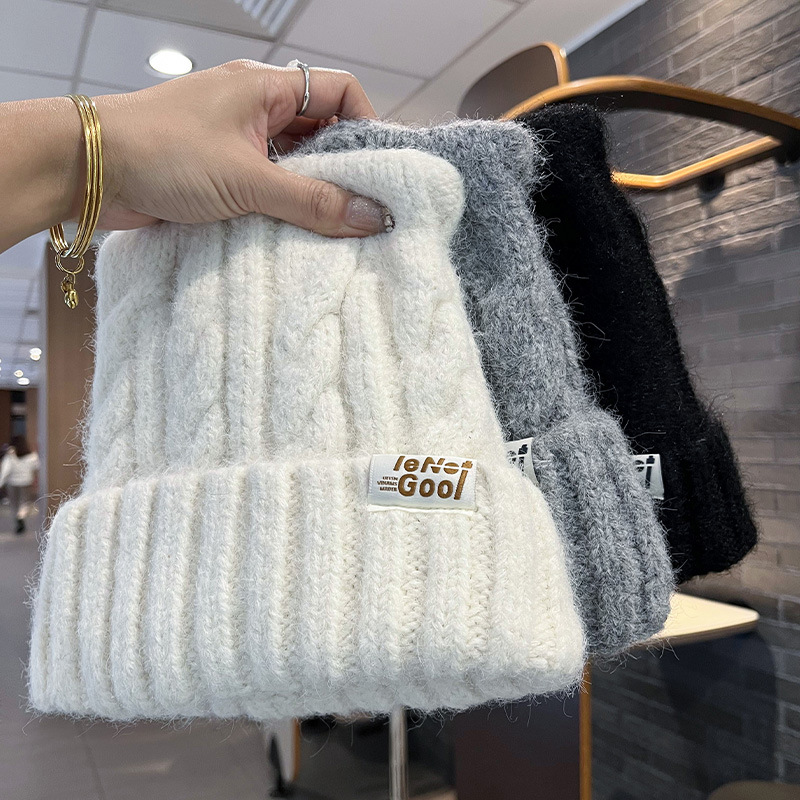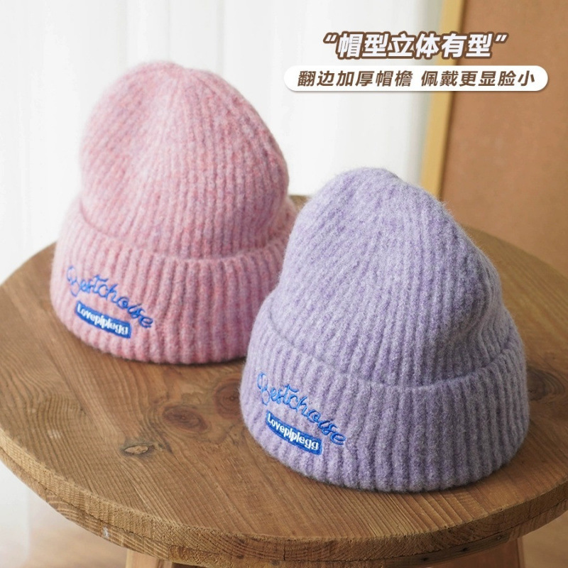 2025新款猫耳字母贴布加厚毛线帽女秋冬季保暖针织帽护耳套头帽子