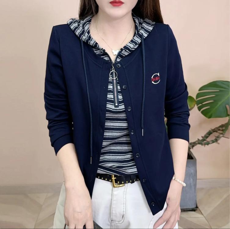 2025早秋新品时尚百搭修身显瘦假两件连帽卫衣女士休闲长袖上衣潮