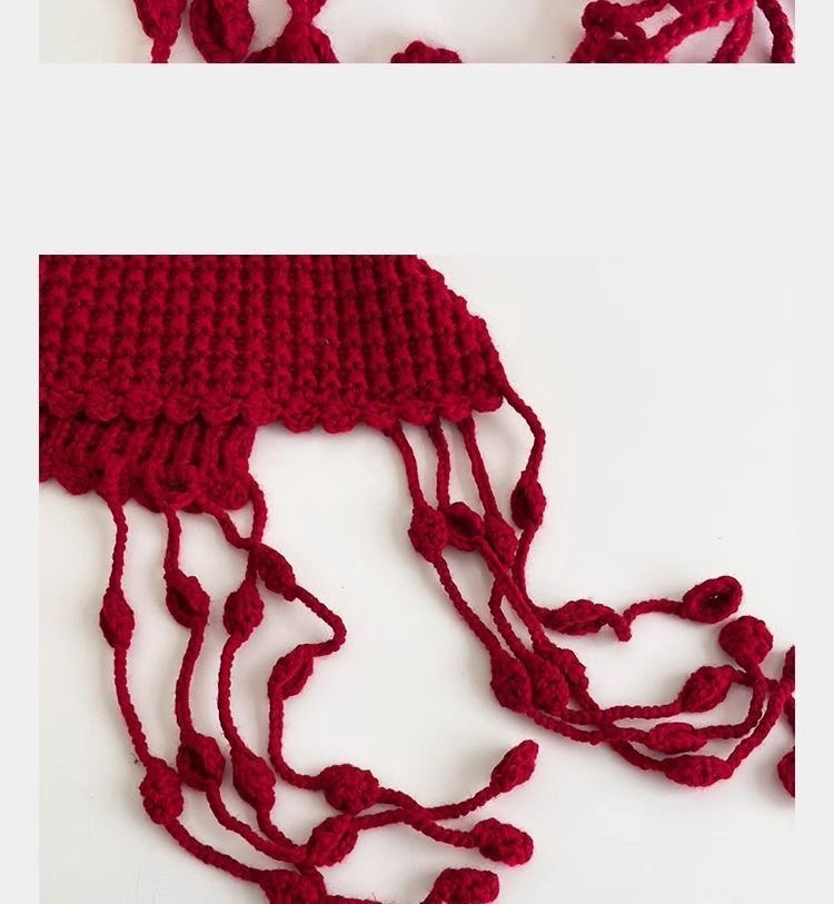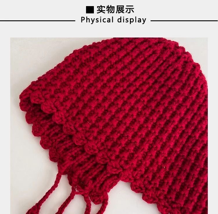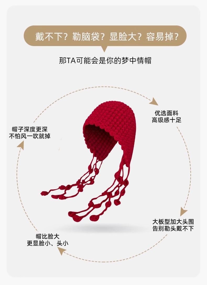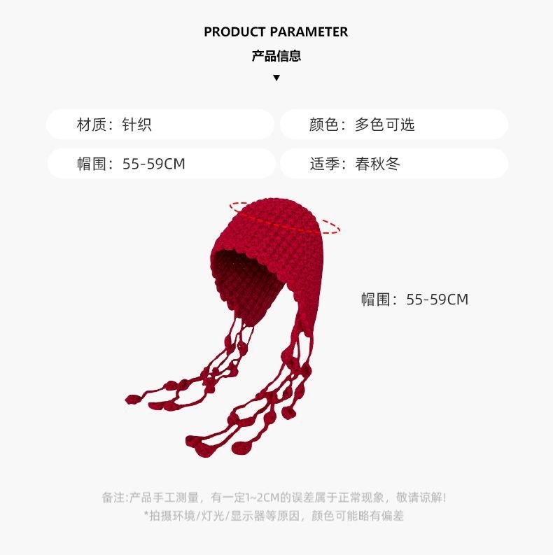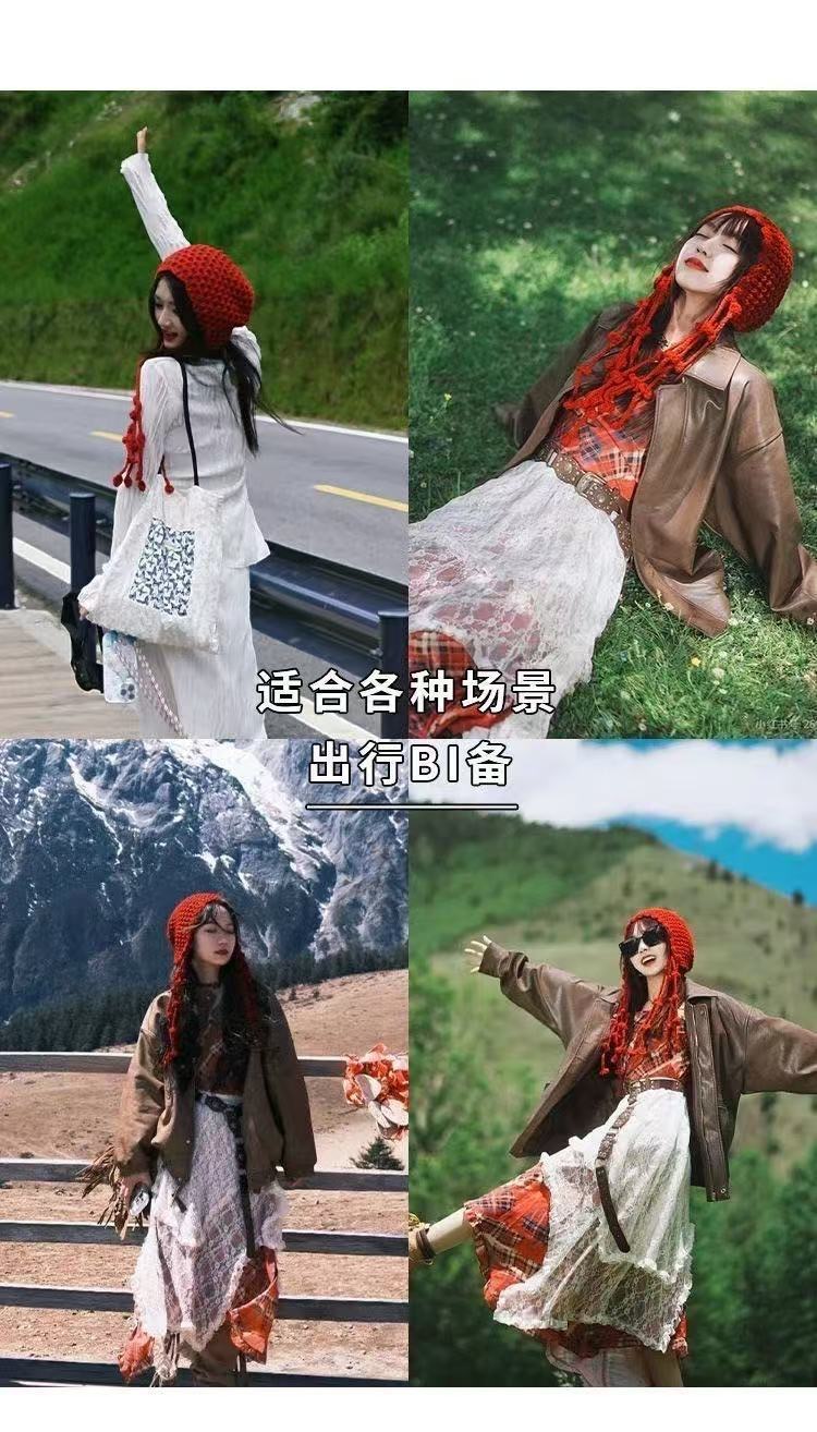 红色针织帽女川西草原旅游包头帽复古网帽镂空网眼流苏护耳套头帽