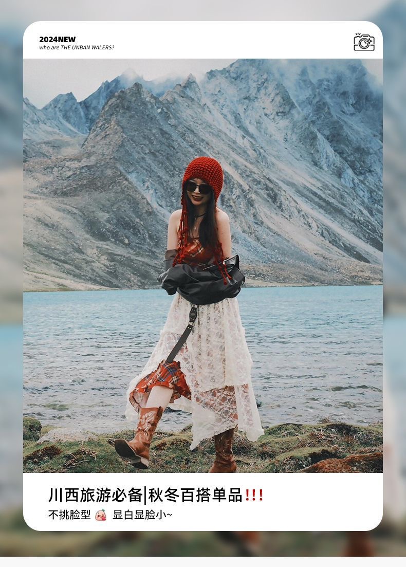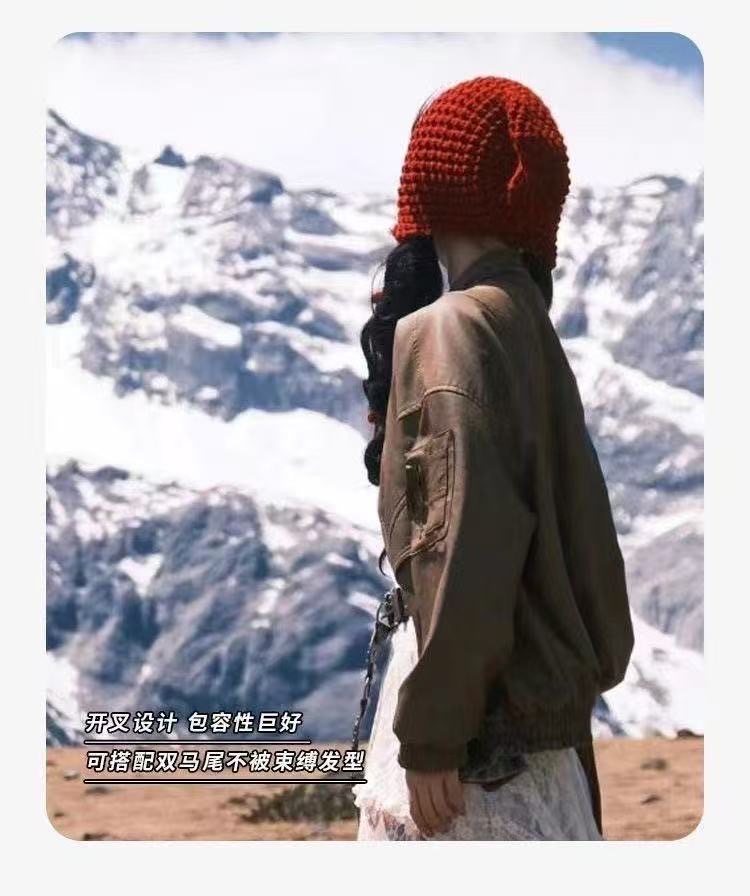 川西旅游出游百搭显脸小流苏绑带镂空针织简约帽子女毛线套头冷帽