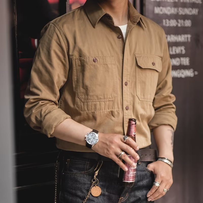 アメリカンレトロヘビーウェイトヘリンボーン柄ワークシャツメンズエンジニア風和風アミカジ風ラペル長袖シャツメンズ