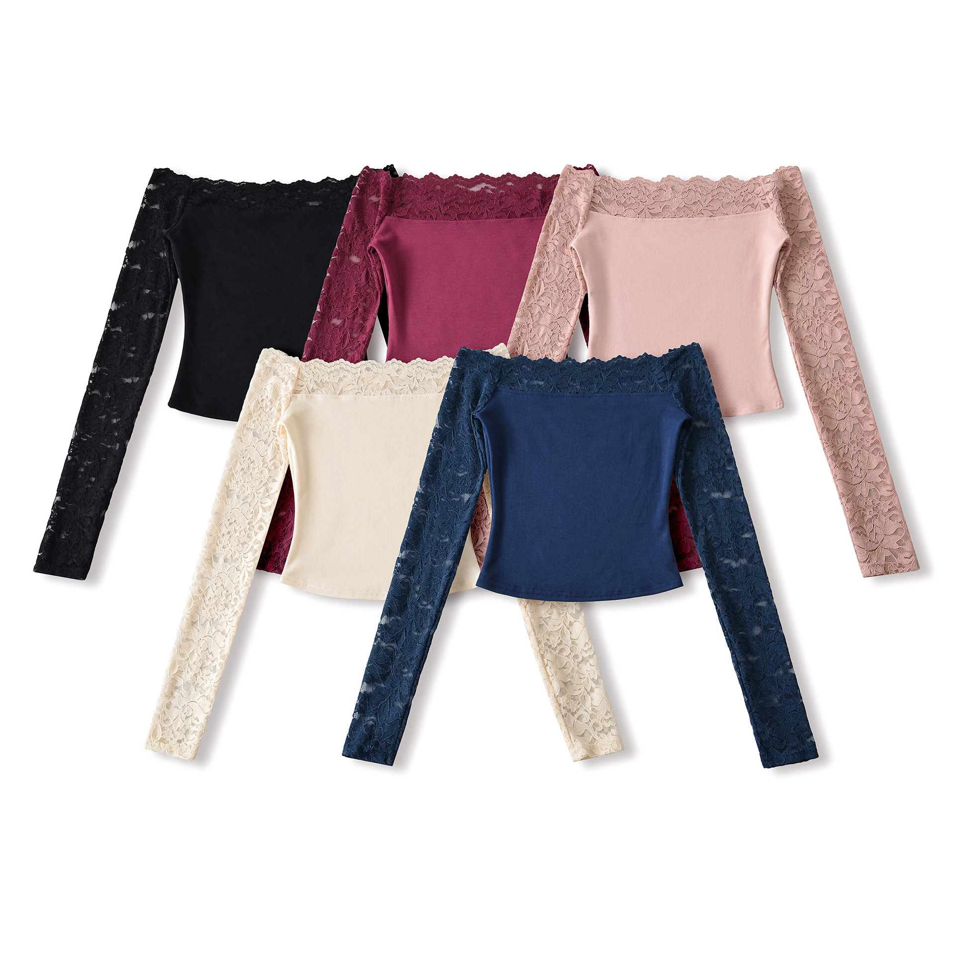 跨境女装批发 蕾丝拼接长袖上衣欧美风秋冬新款修身一字领长袖t恤