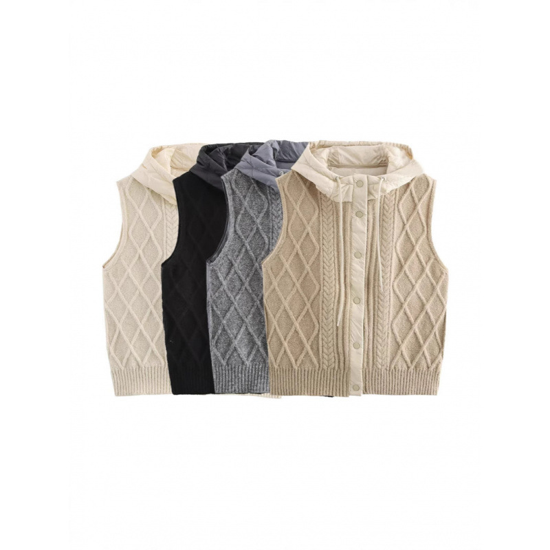 ZA女装2024年冬季欧美时尚复古麻花绗棉拼接针织连帽开衫马甲背心