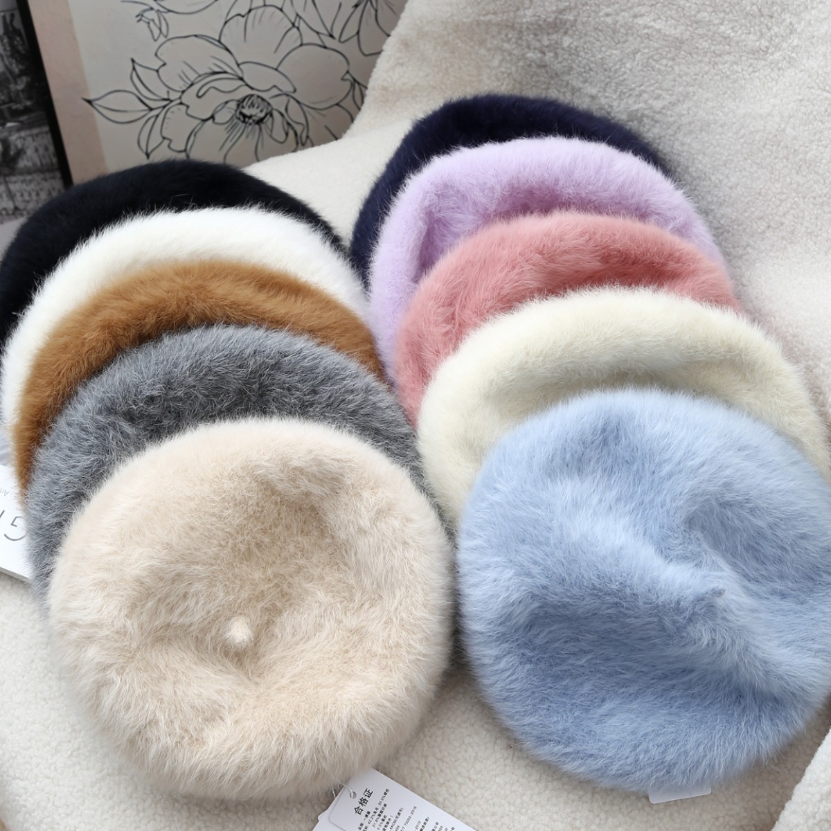 ウサギ毛のベレー帽、女性用マカロンカラー無地の毛糸ニット画家帽、秋冬の和風ベルベットベレー帽