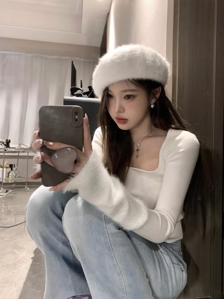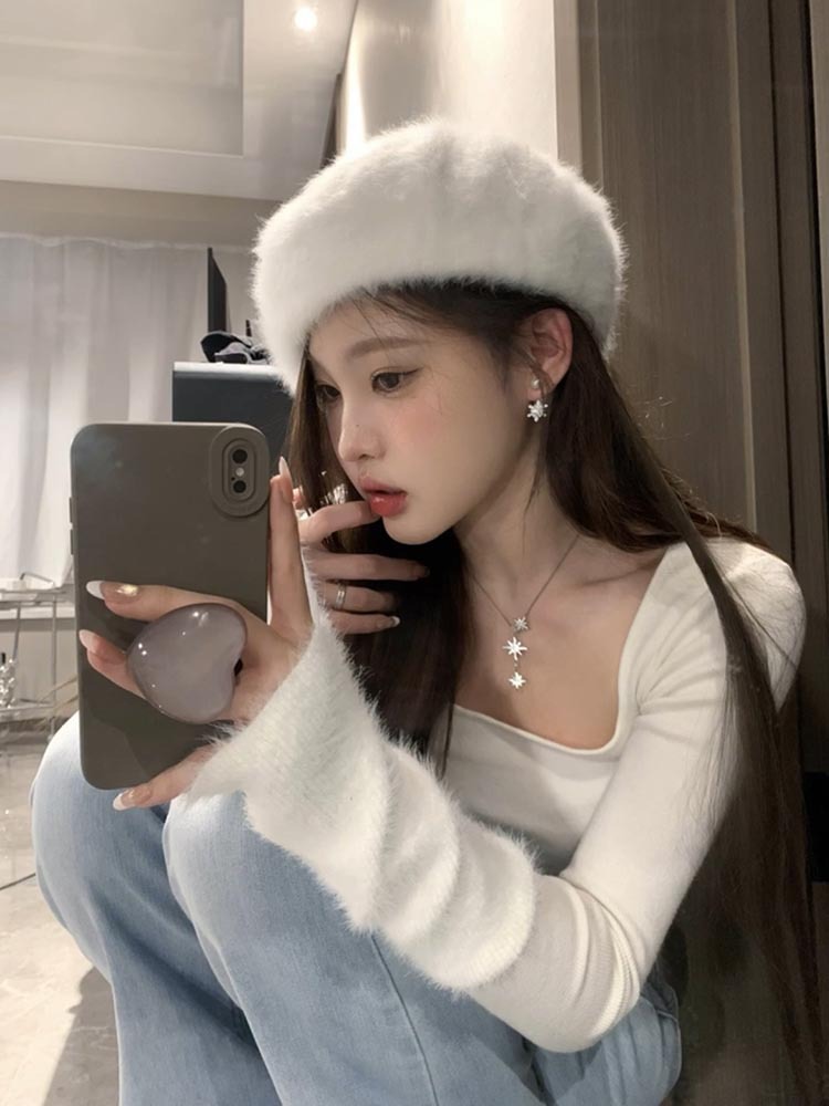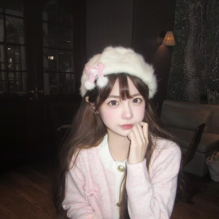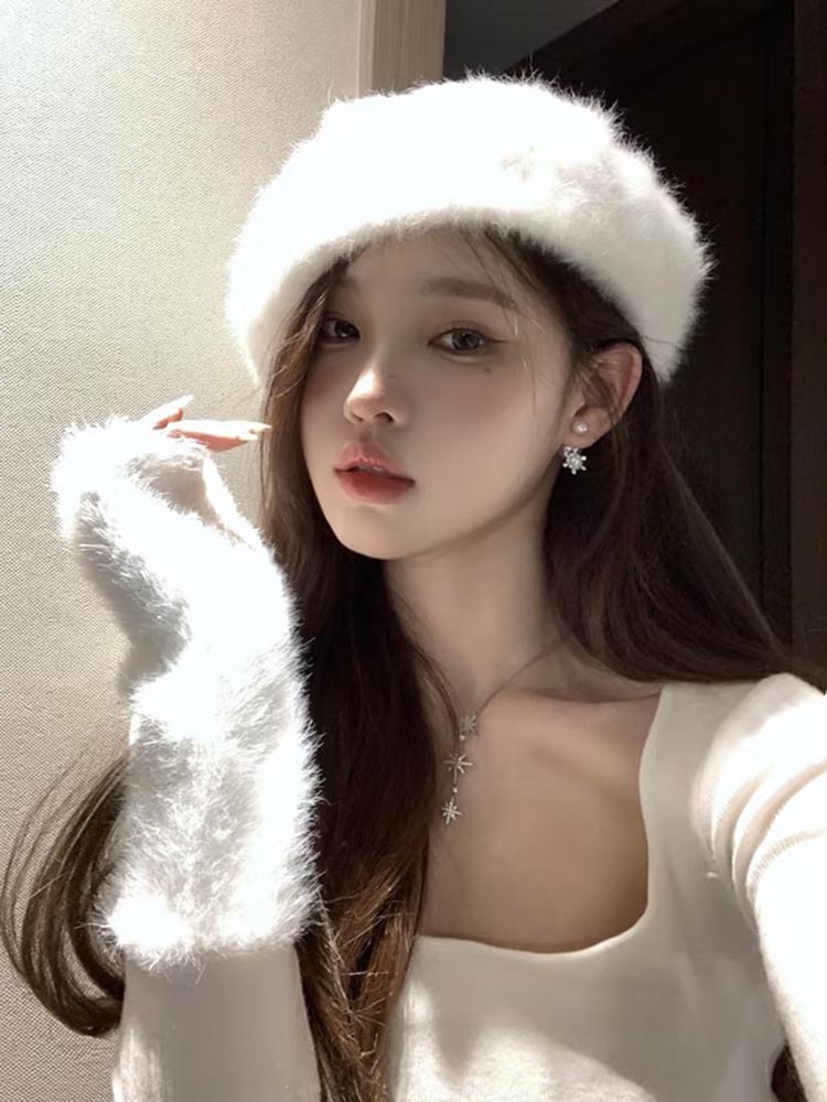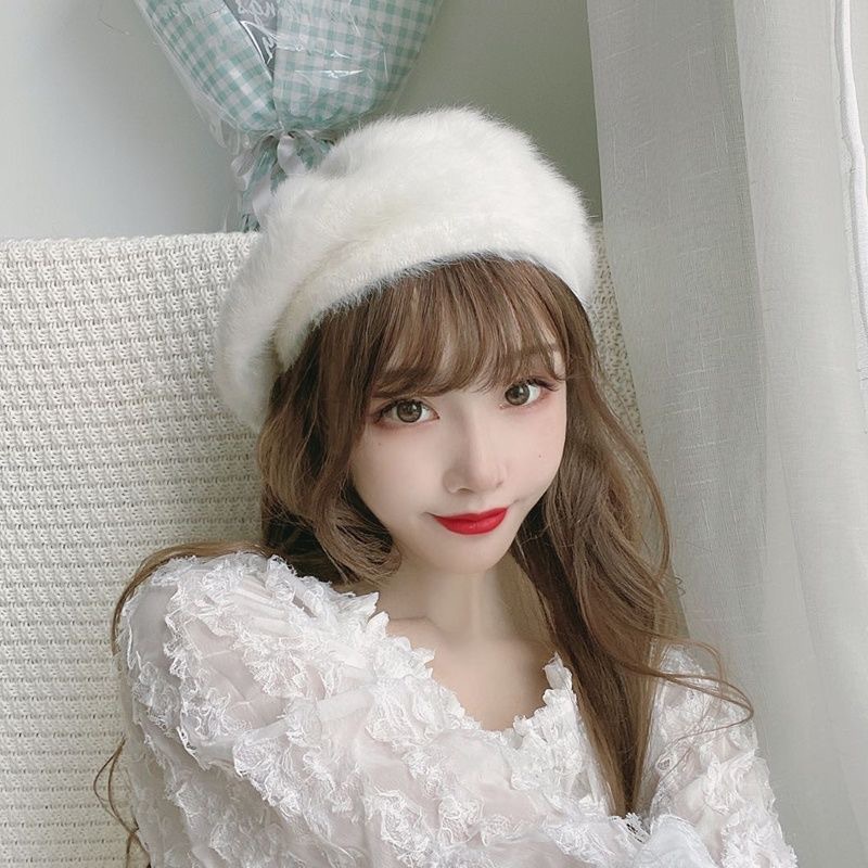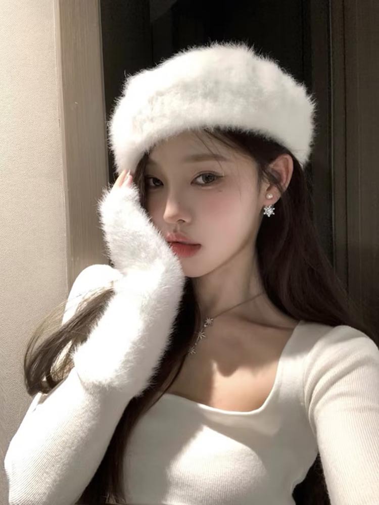 气质千金~毛绒绒白色兔毛贝雷帽女秋冬气质小香风百搭画家帽批发