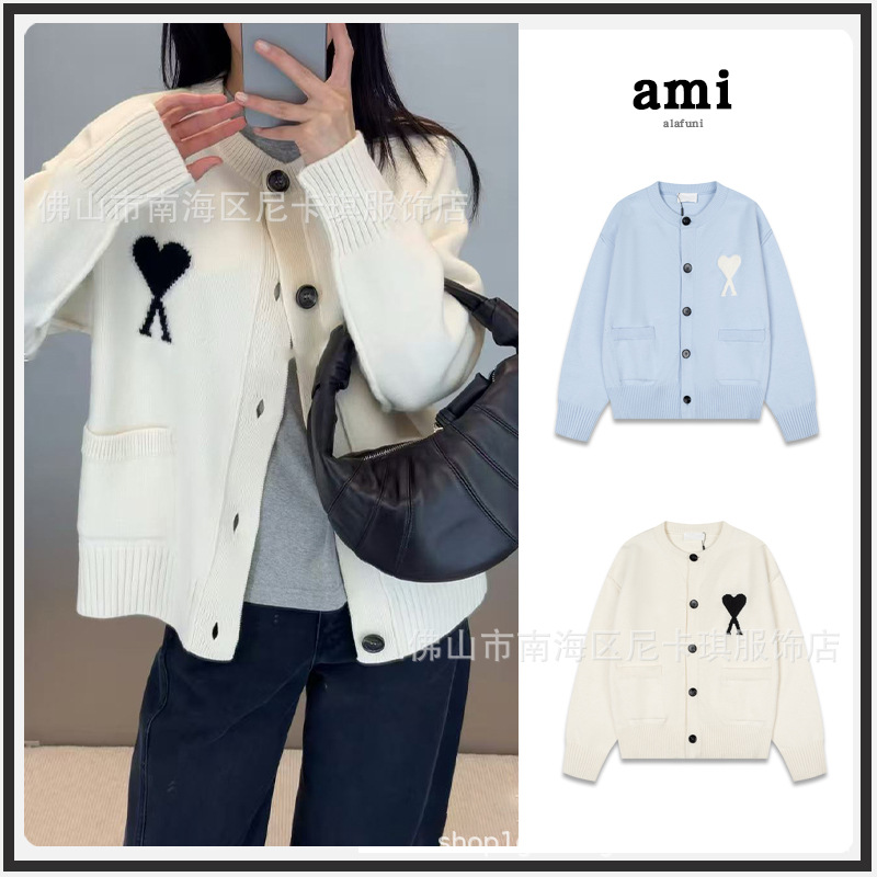 ami ニットカーディガン ビッグラブ 25SS 新作 ハイウェイト シングルブレスト トップ Vネック クロスボーダー ウール セーター ジャケット