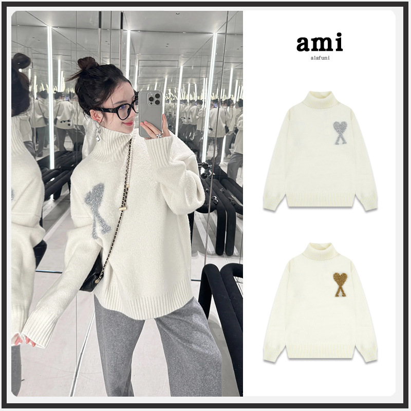 ami毛衣25ss秋冬新款跨境银心刺绣软糯感金心男女开衫高领针织衫