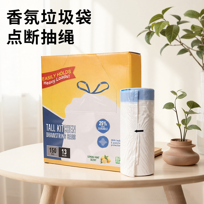 跨境白色抽绳垃圾袋加厚家用厨房自动收口点断式垃圾袋手提式批发