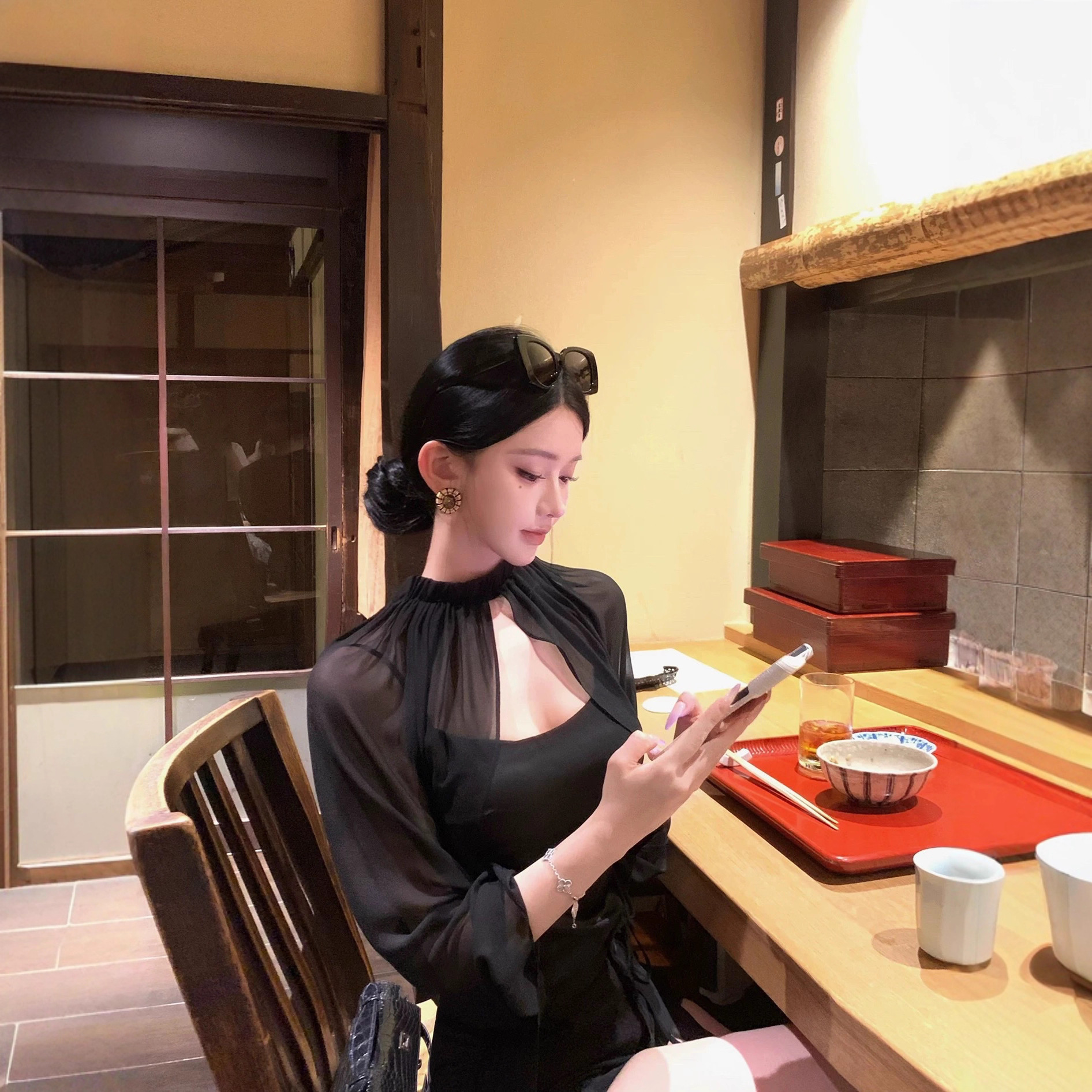 JAYKY YANG嘉伯丽尔黑色雪纺披肩斗篷缎面收腰短款吊带两件套