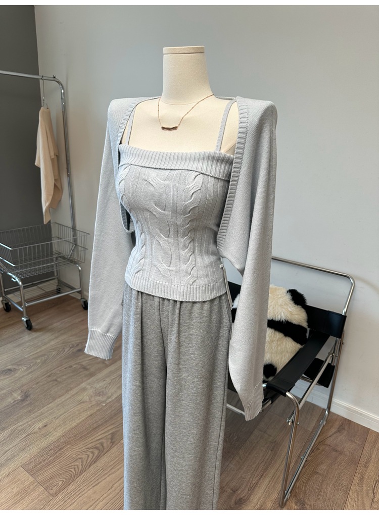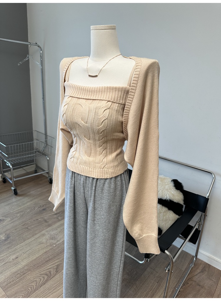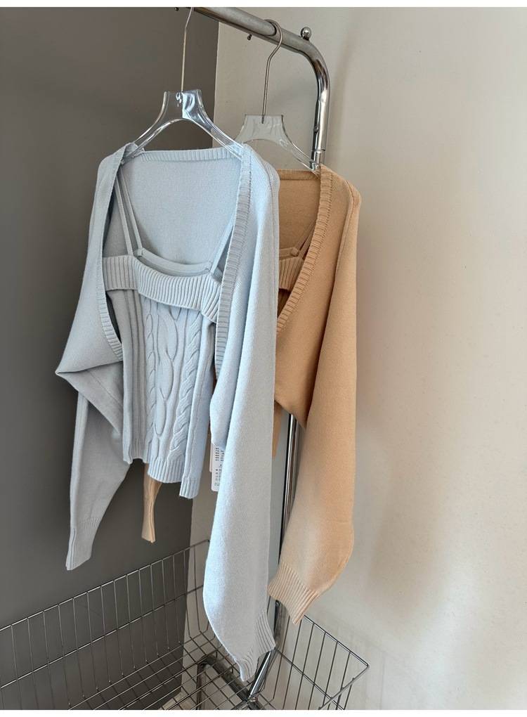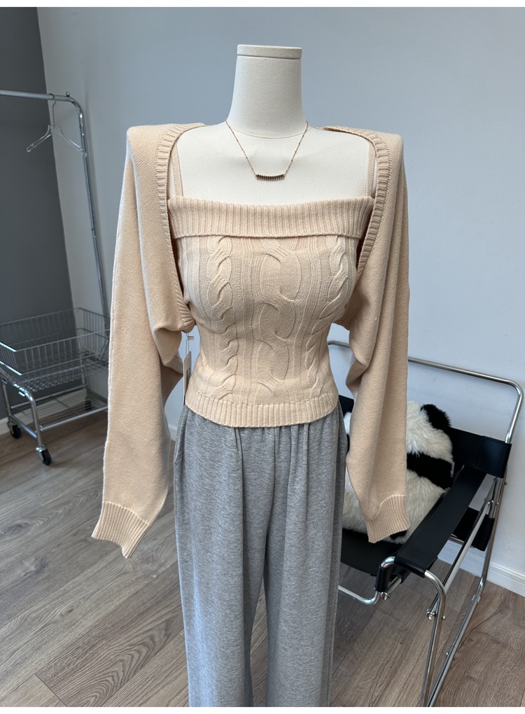 摩卡慕斯 灯笼袖绞花吊带背心开衫针织两件套