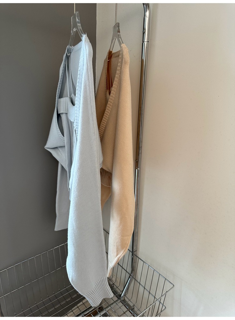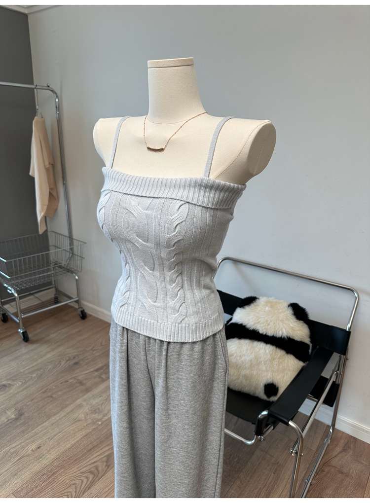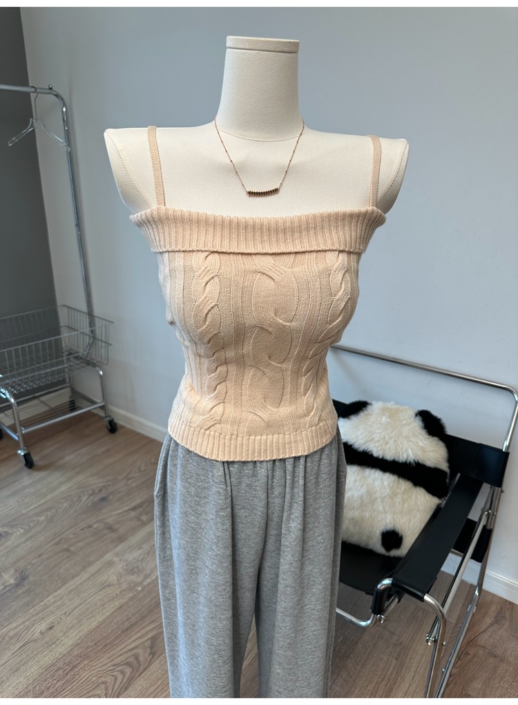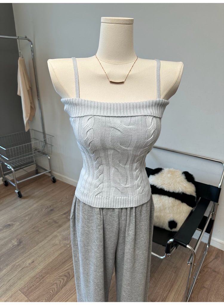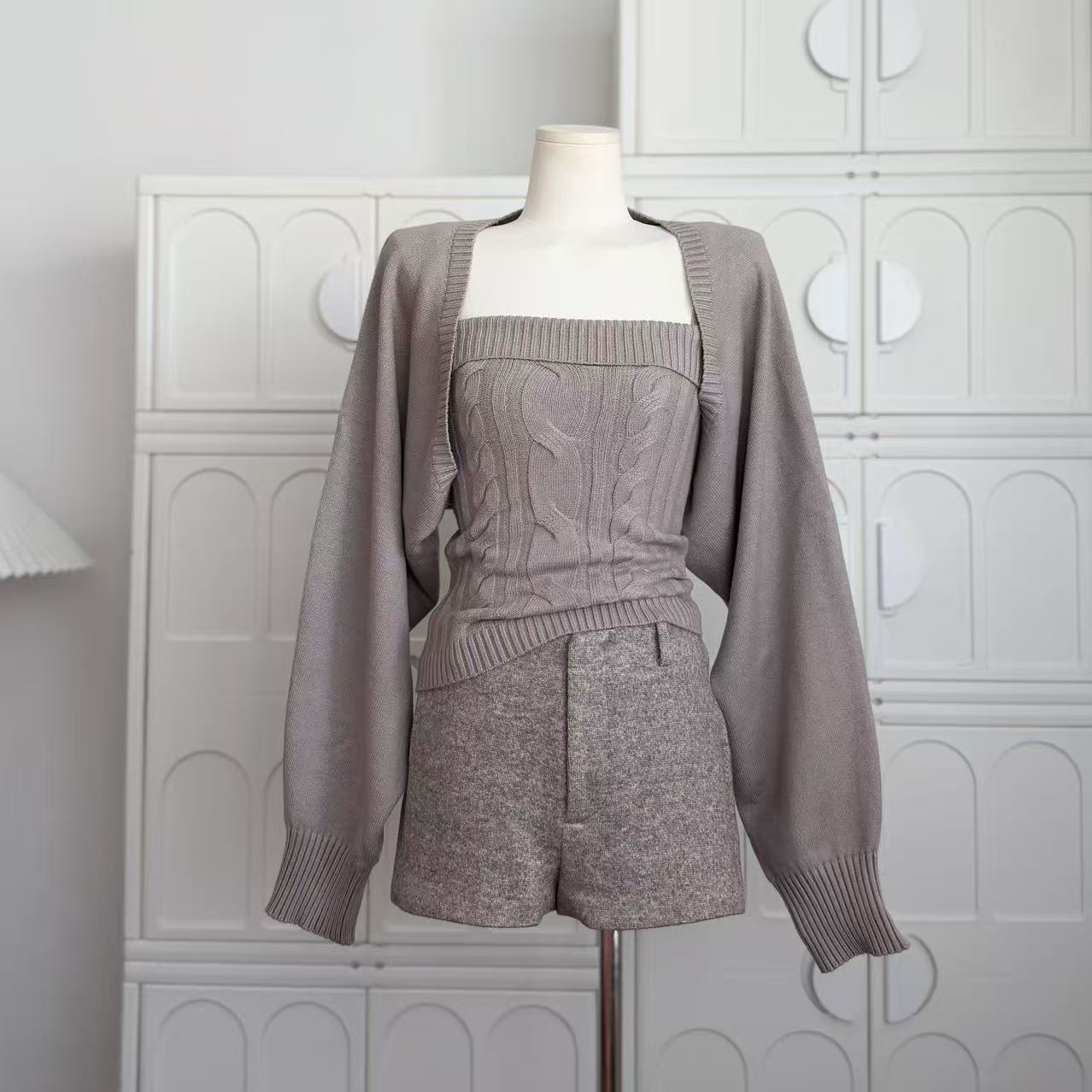 摩卡慕斯 灯笼袖绞花吊带背心开衫针织两件套