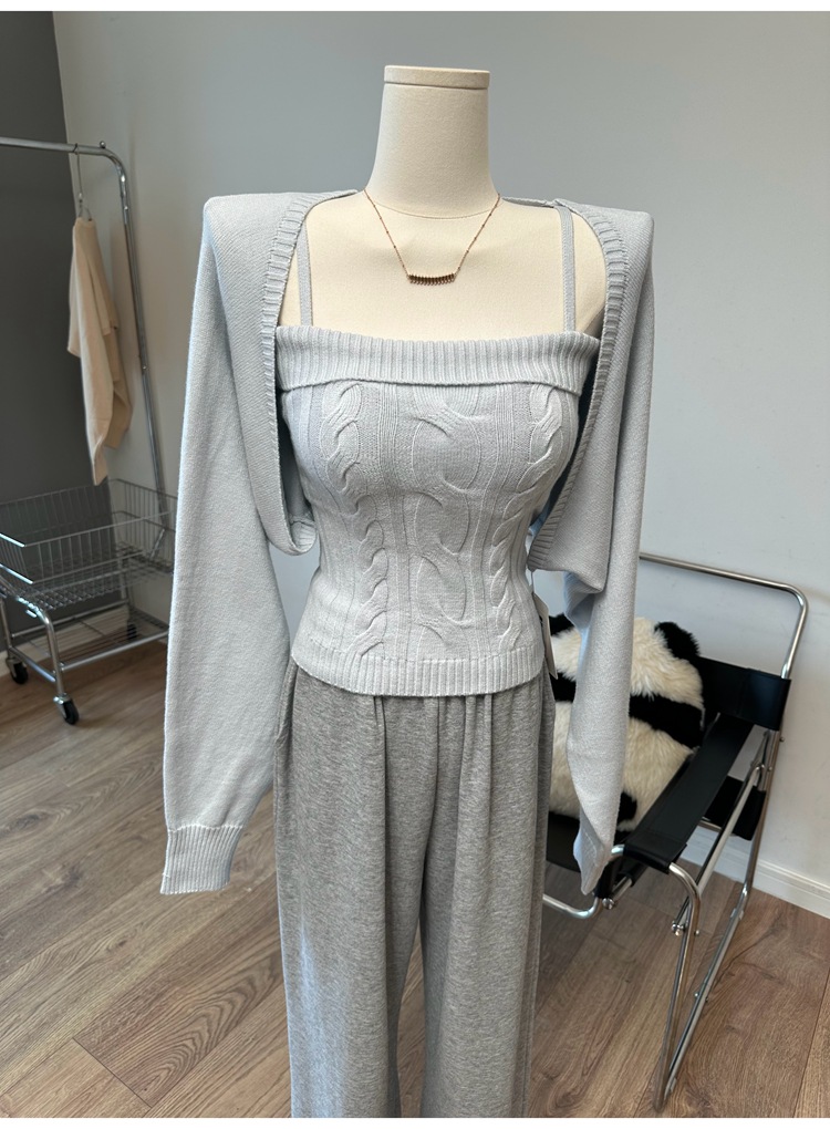 现货 东大门 麻花吊带背心长袖开衫披肩毛衣两件套时尚套装针织衫