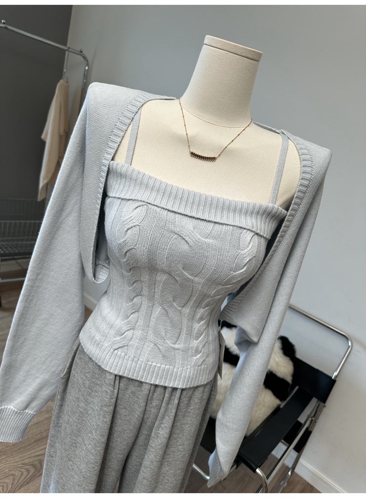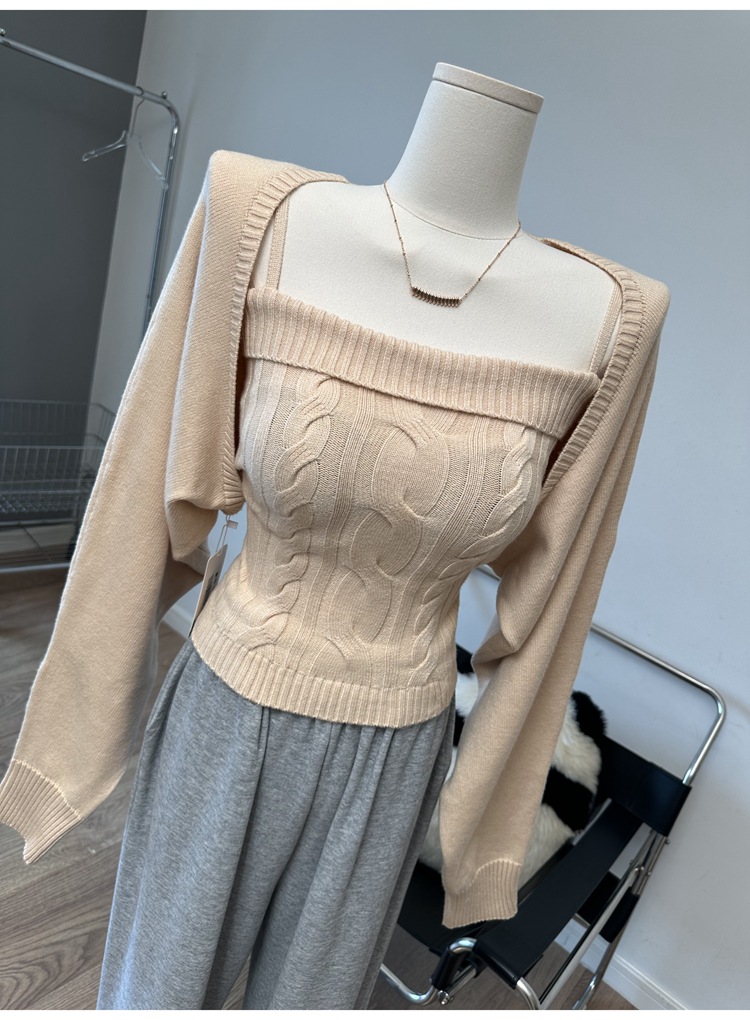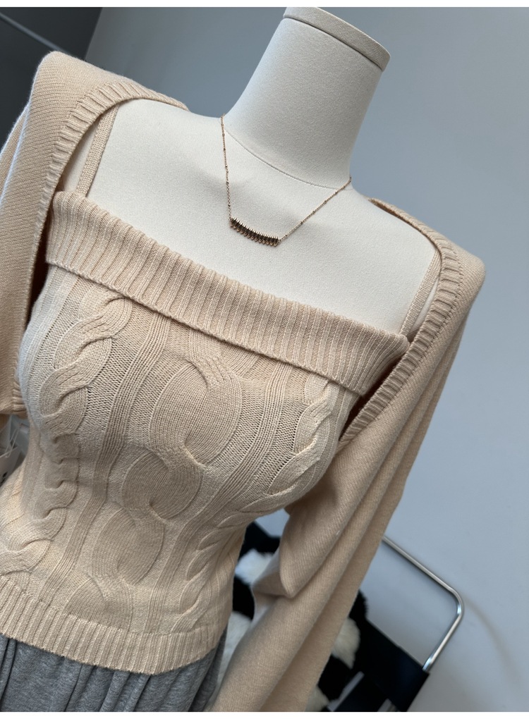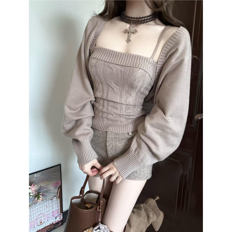 韩系纯欲风时尚套装秋冬新款绞花修身吊带女灯笼袖披肩针织两件套
