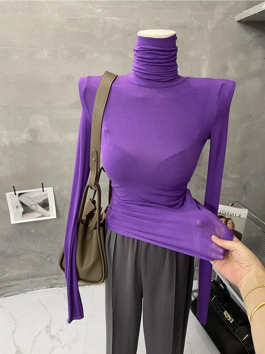薄いタイプ基礎金の山襟の底のシャツの女性の高襟の長袖のtシャツの純色のガードルの中で上着の秋を掛けます。