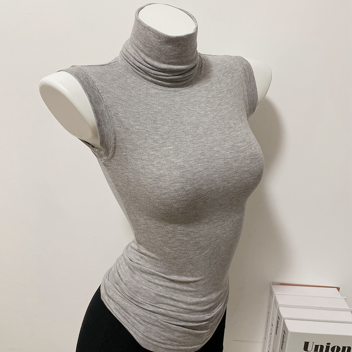 小さい腰の精は良い体つきの中で袖なしの洋気を着て純色の高襟の気質を身につけて上着のtシャツを打ちます。
