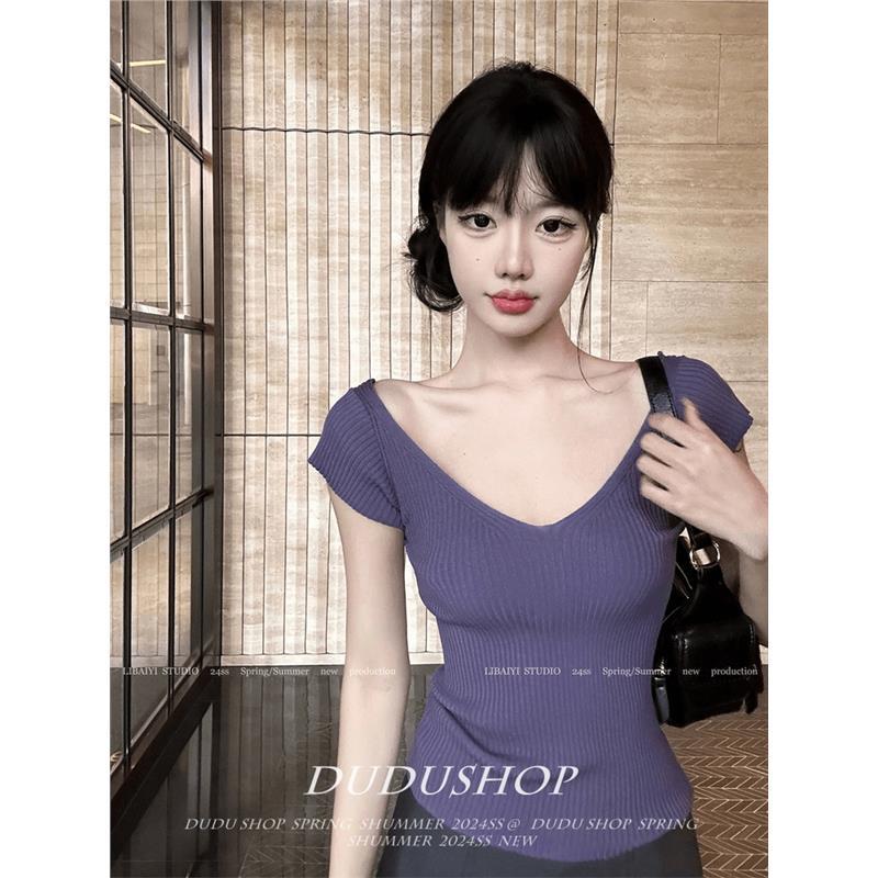 紫vネックニットの肩の半袖tシャツ女性の夏のtシャツのフランス式のウエストを絞めたデザイン感があります。