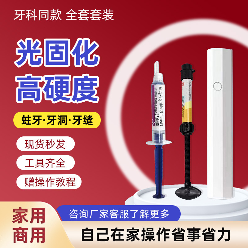 自宅で虫歯を修復するためのツール、虫歯の穴を埋めるためのレジン素材、前歯の歯冠、欠損歯を模倣した歯冠、歯肉保護
