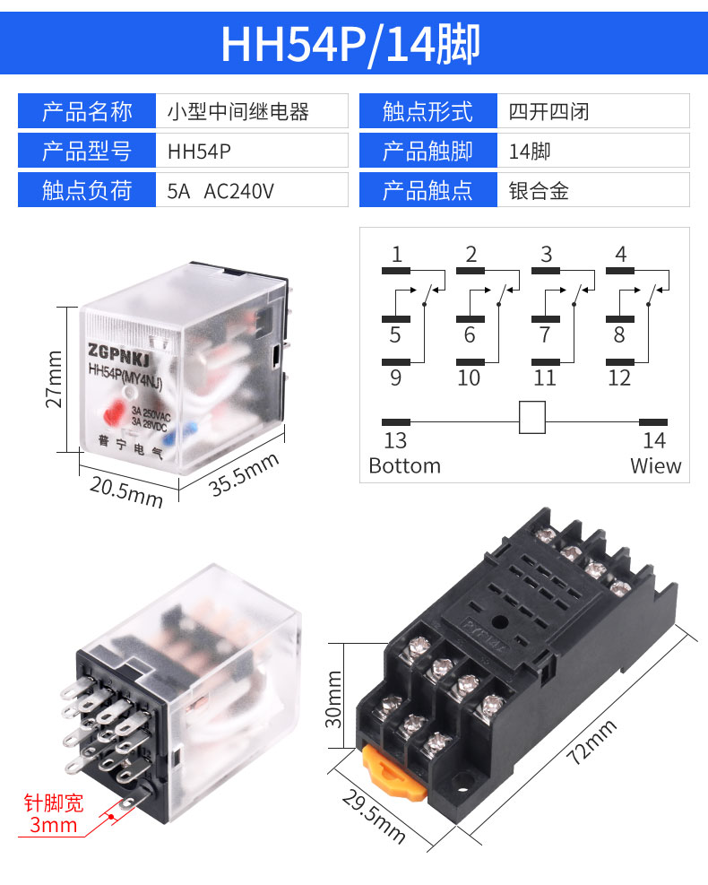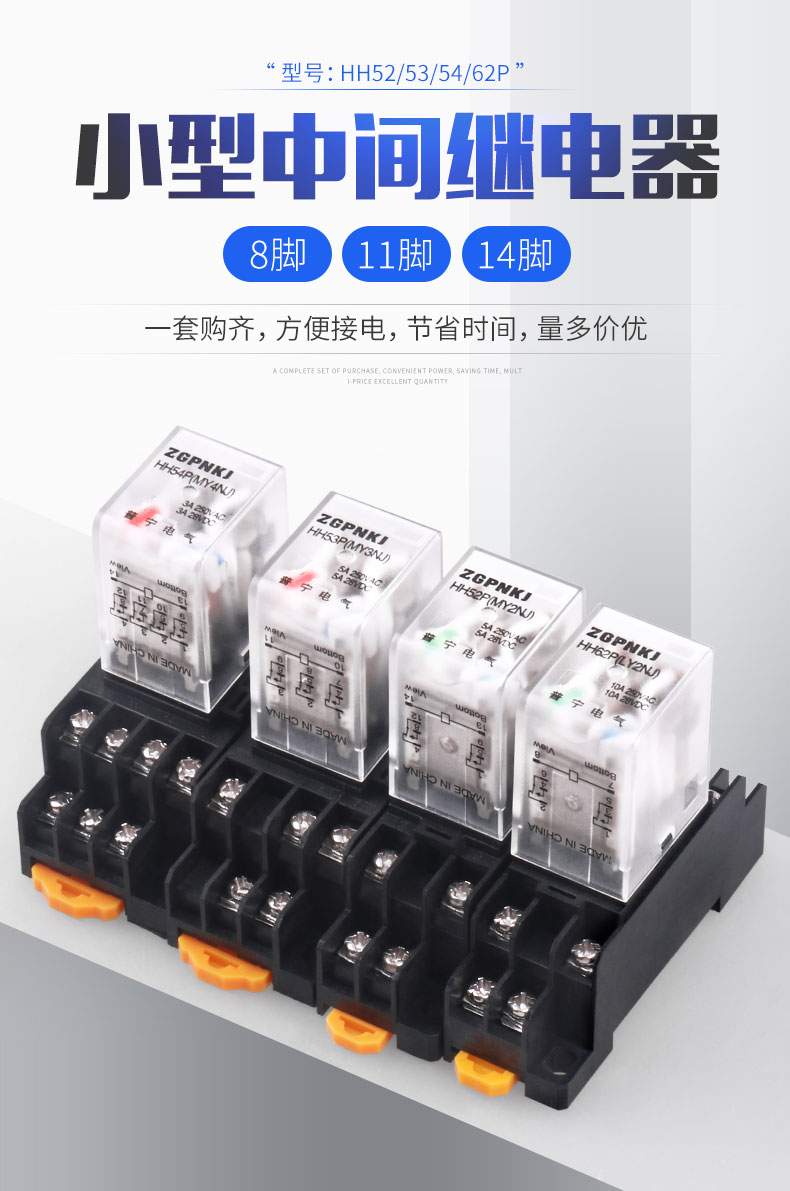 HH54P小型中间电磁继电器220V交流380v三相14脚dc24V12v底座8脚
