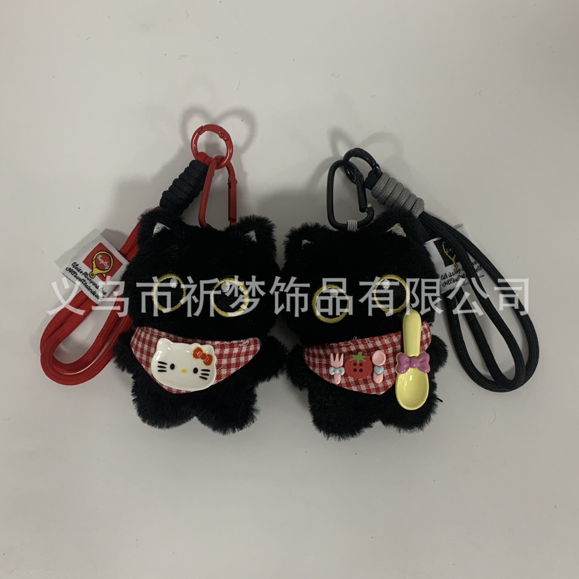颜色 红格纹围兜盘子kitty小黑猫+红挂绳,番茄围兜勺子小黑猫+黑挂绳