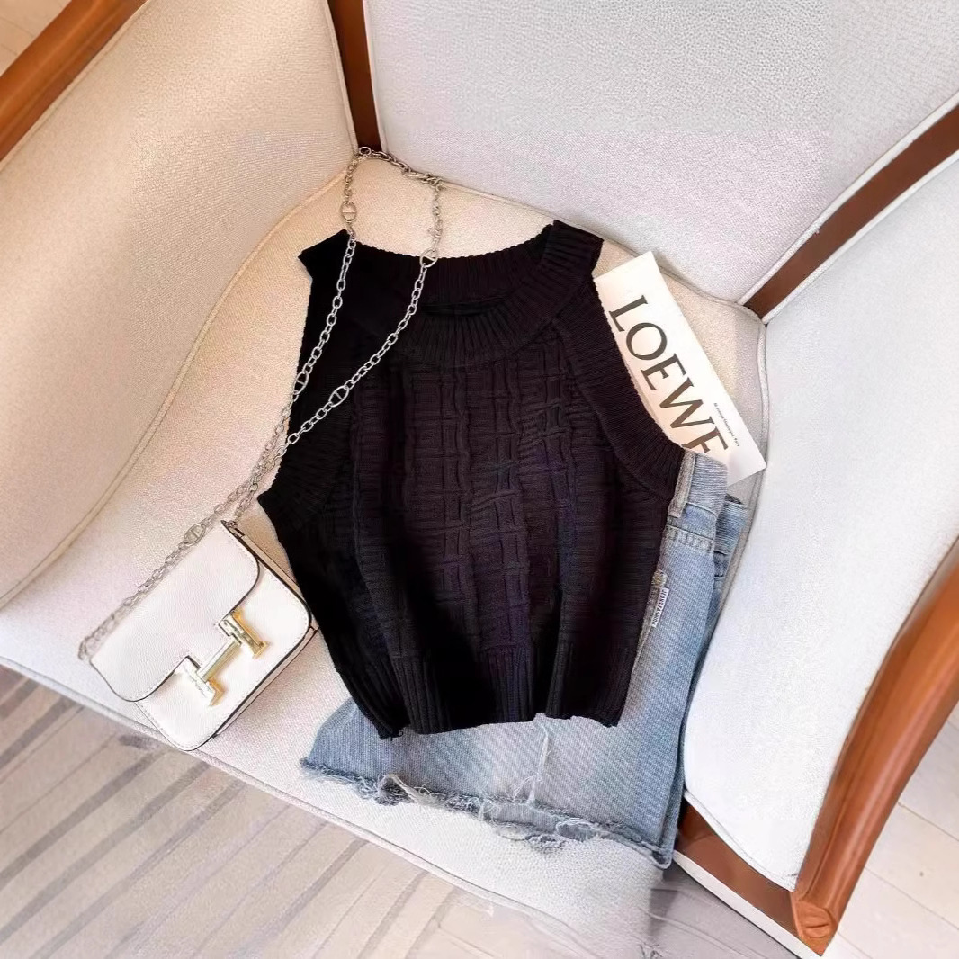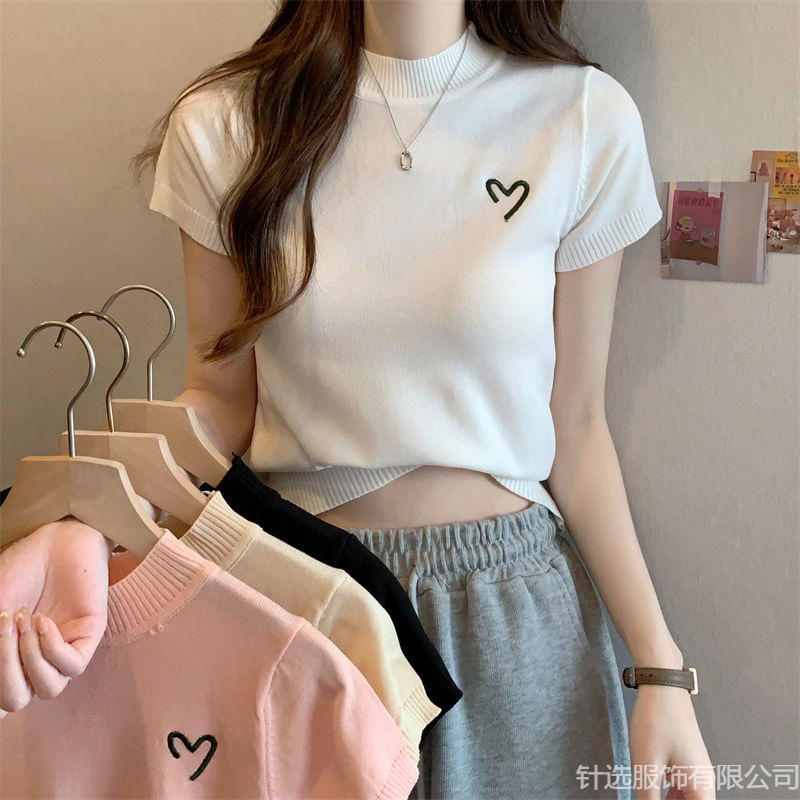 2025年の韓国版の新型の半高襟の肩のニットの馬甲のtシャツの女性のシンプルでゆったりしている短い半袖の上着の夏