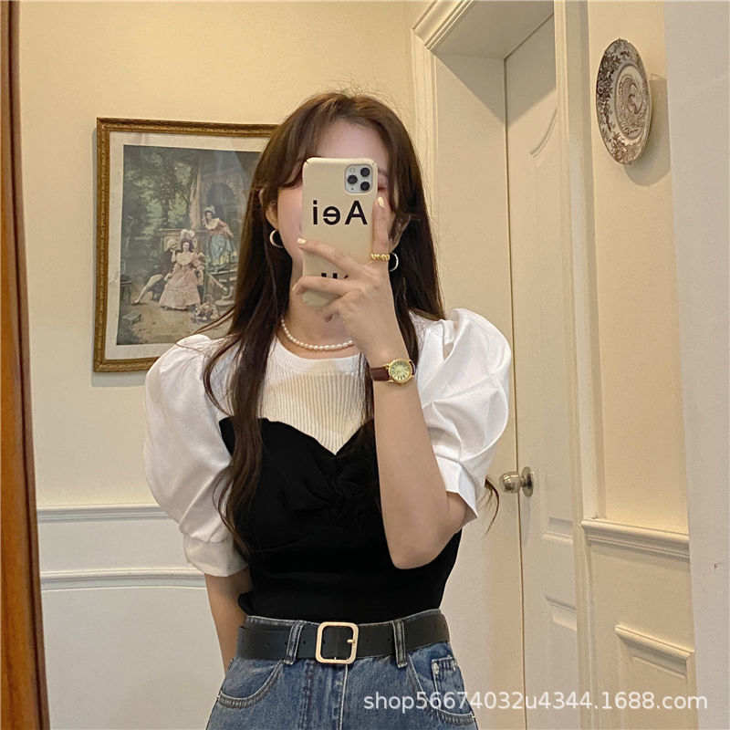 胸を拭いて偽の2枚のニット半袖tシャツをつなぎます。