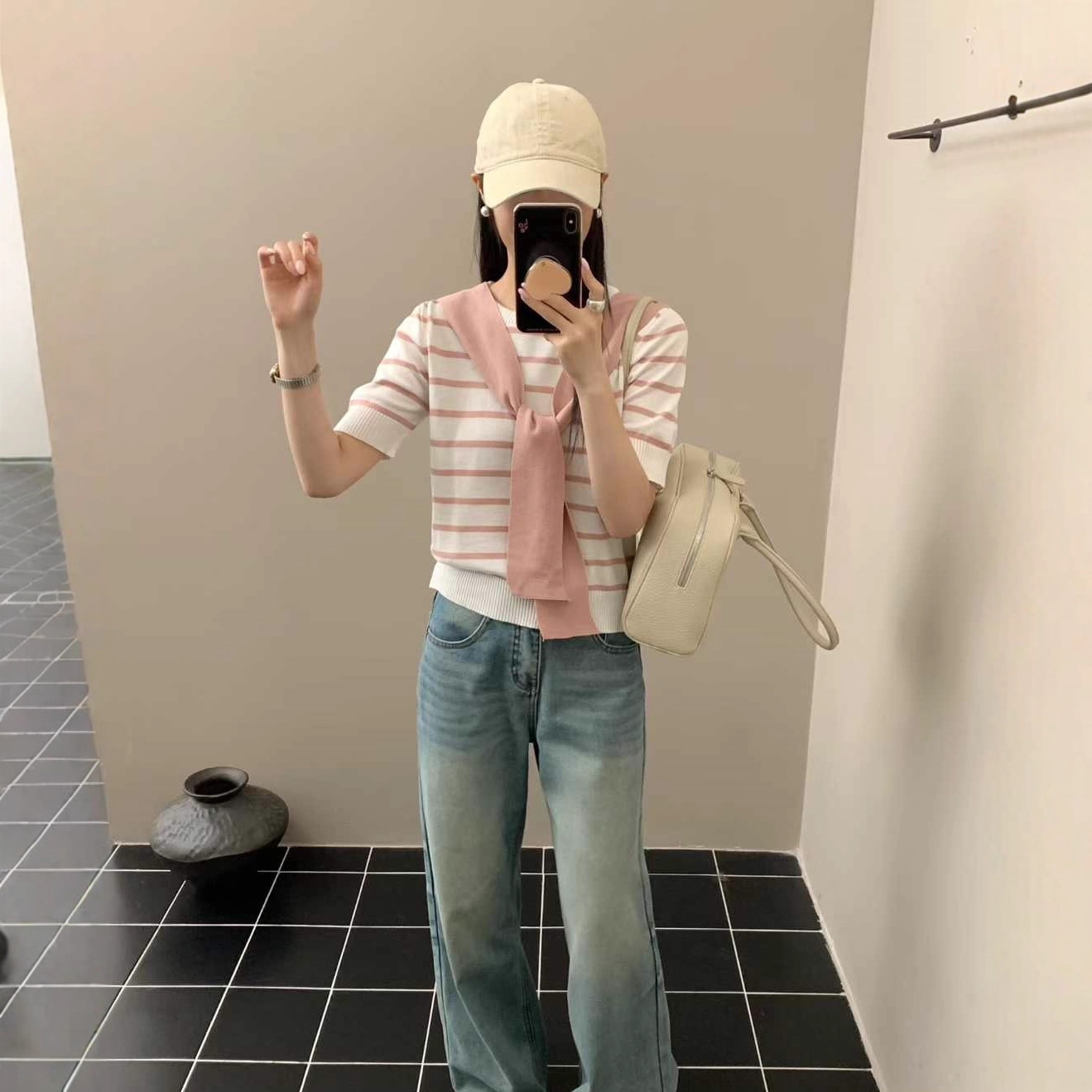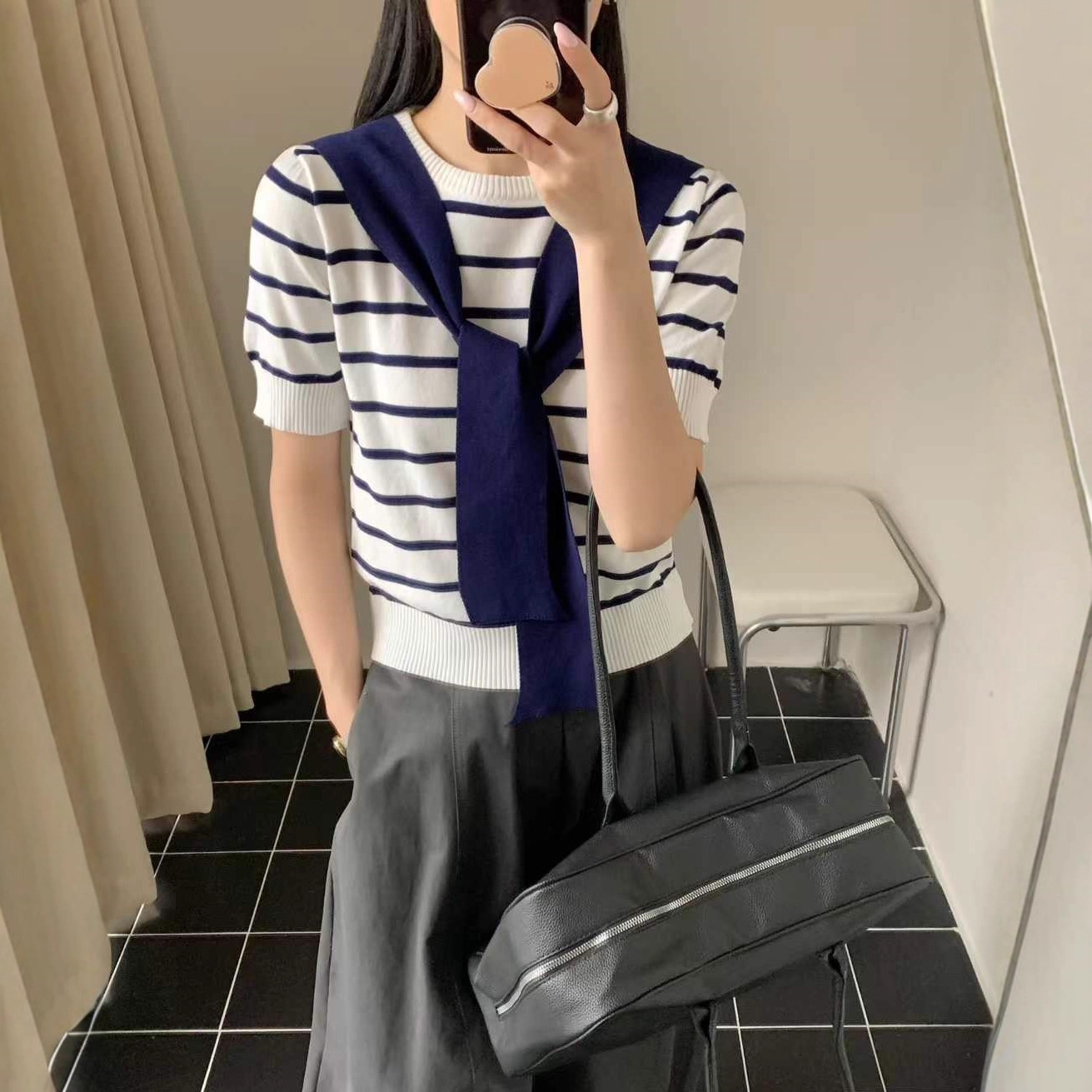 韩系撞色条纹短袖针织衫2025夏季新款带披肩休闲穿搭宽松显瘦上衣
