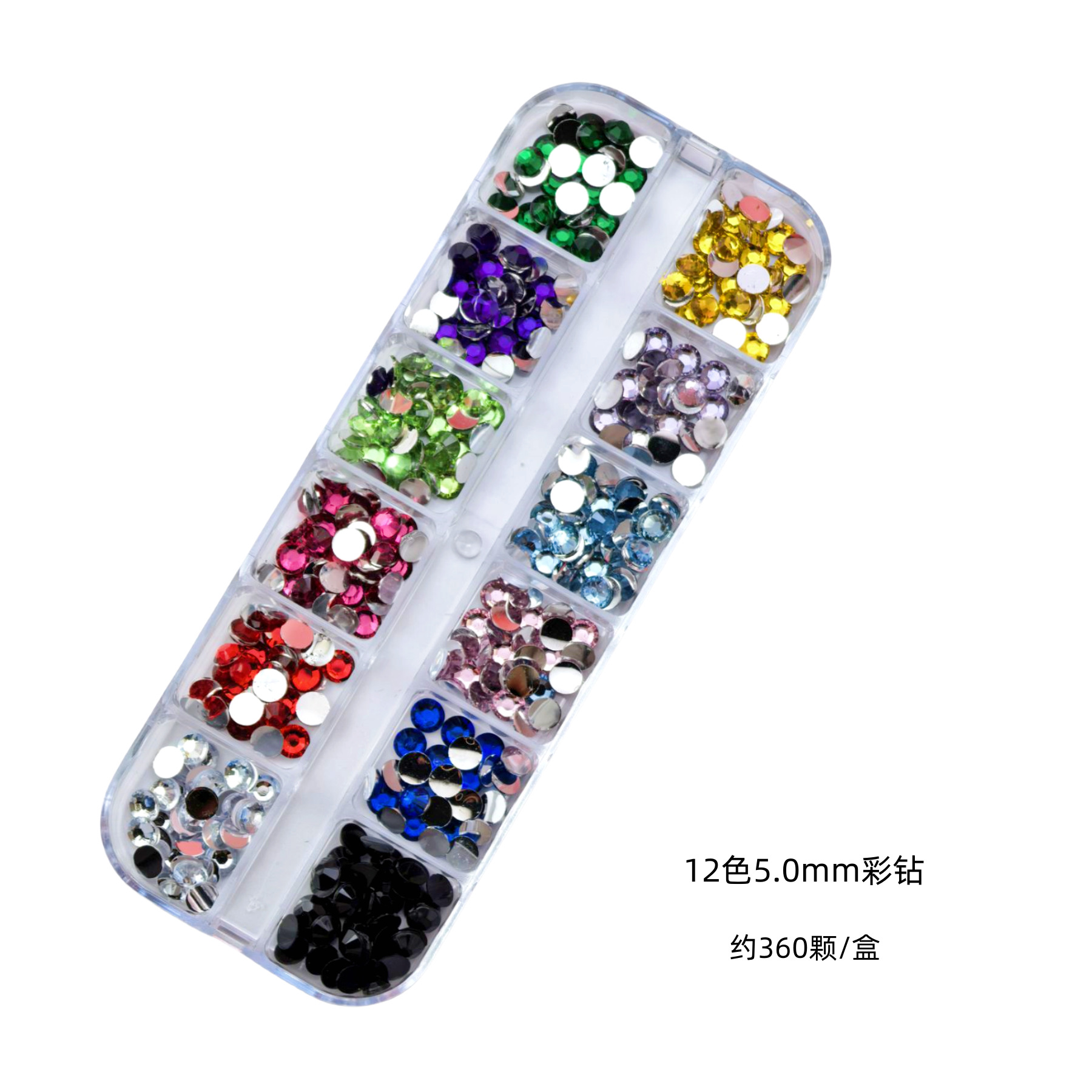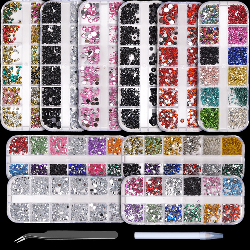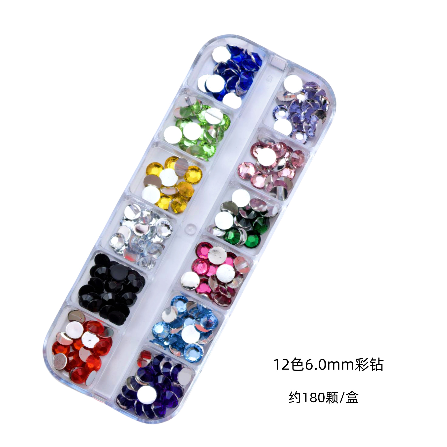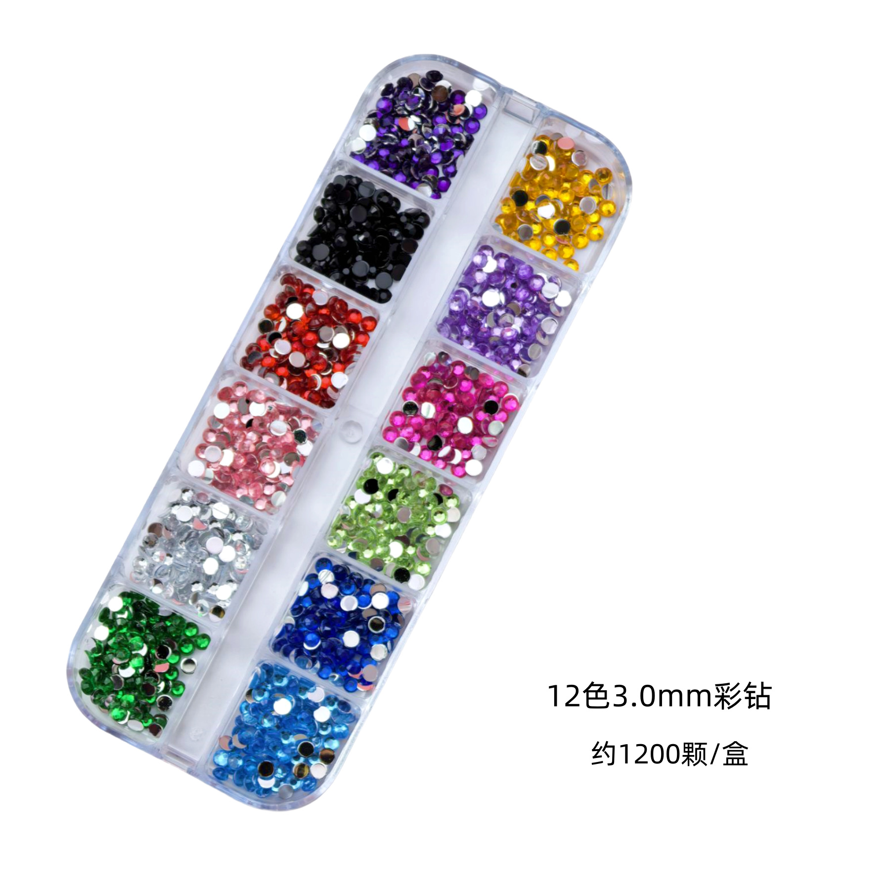 跨境美甲钻饰品12格盒美甲钻多尺寸混装钻彩色圆形平底钻盒装