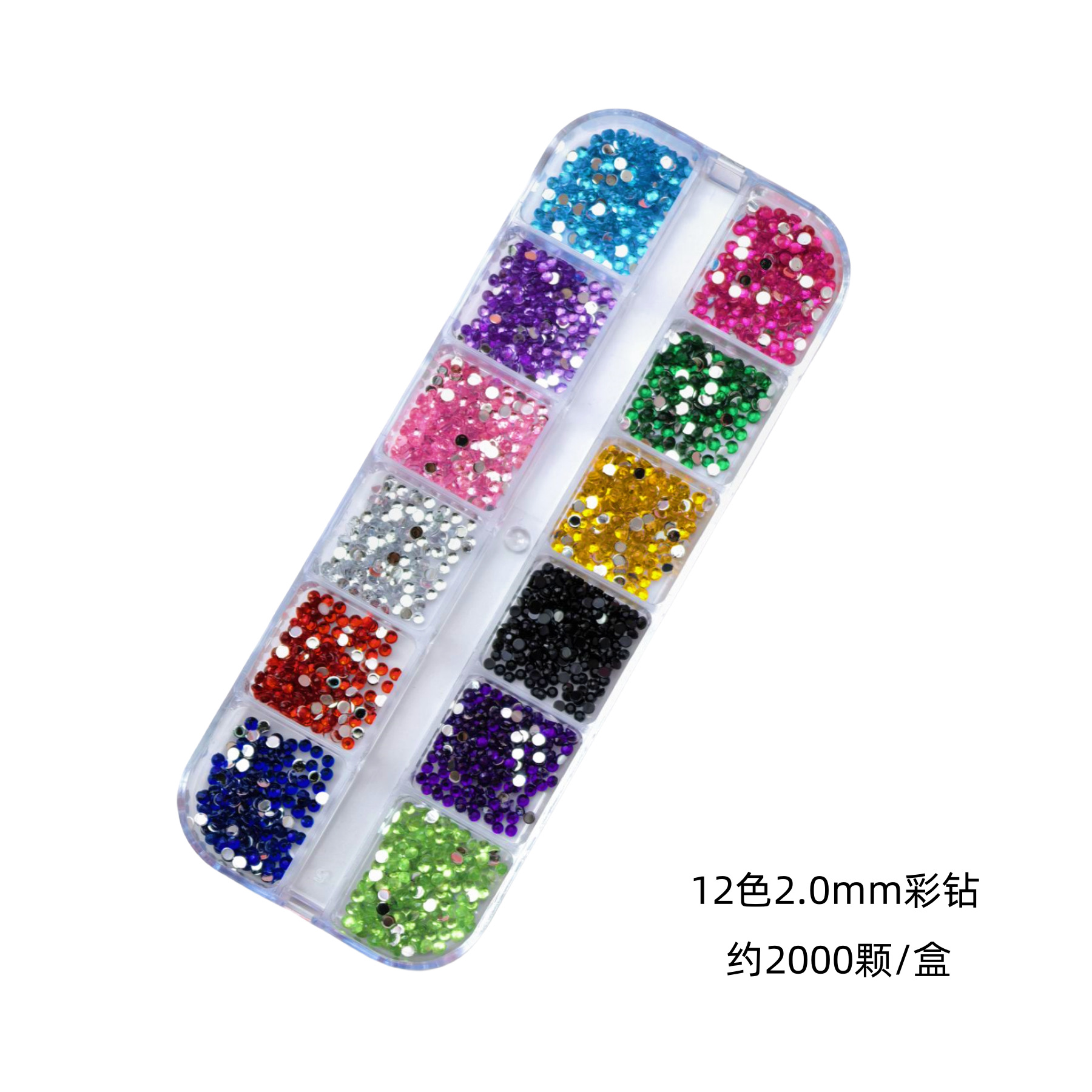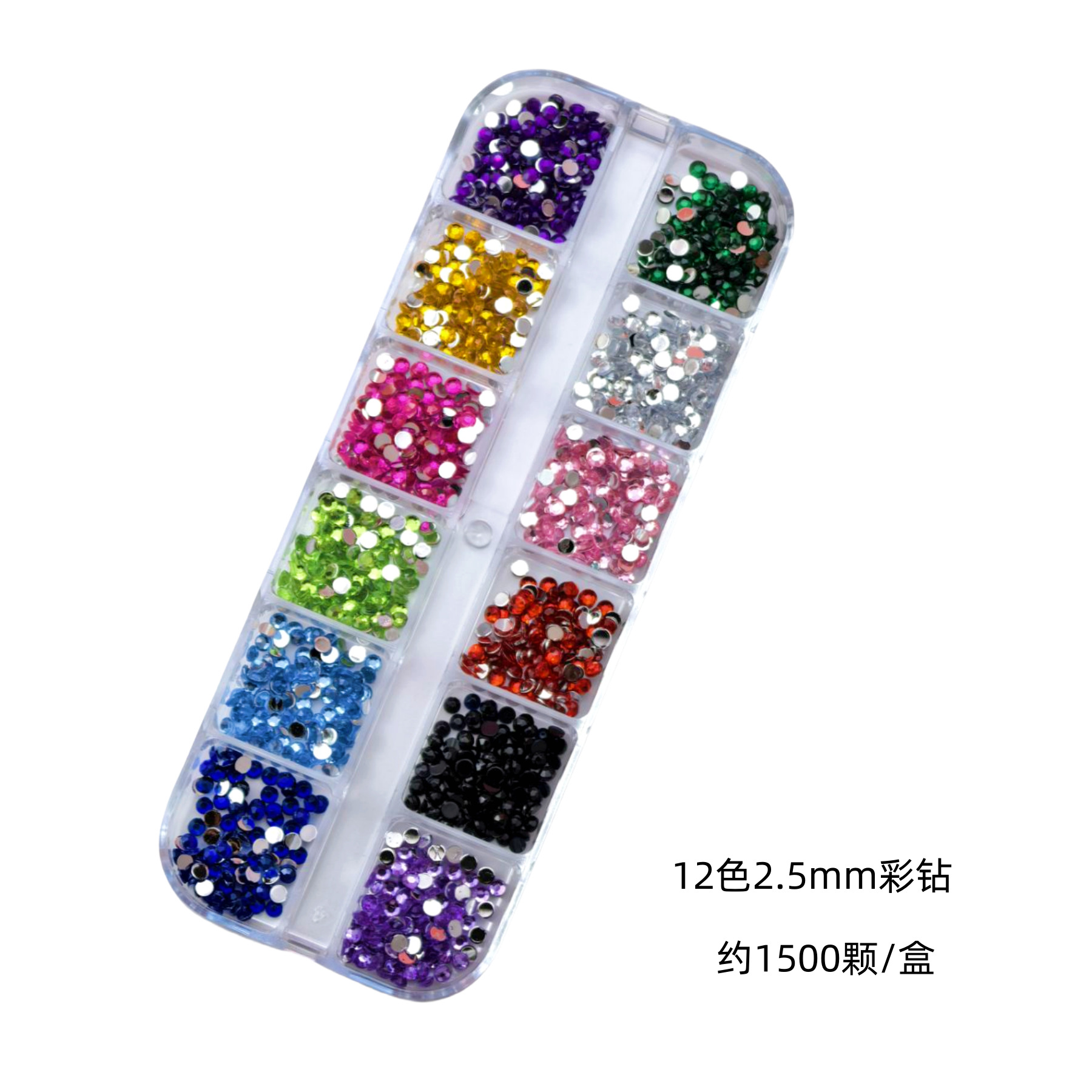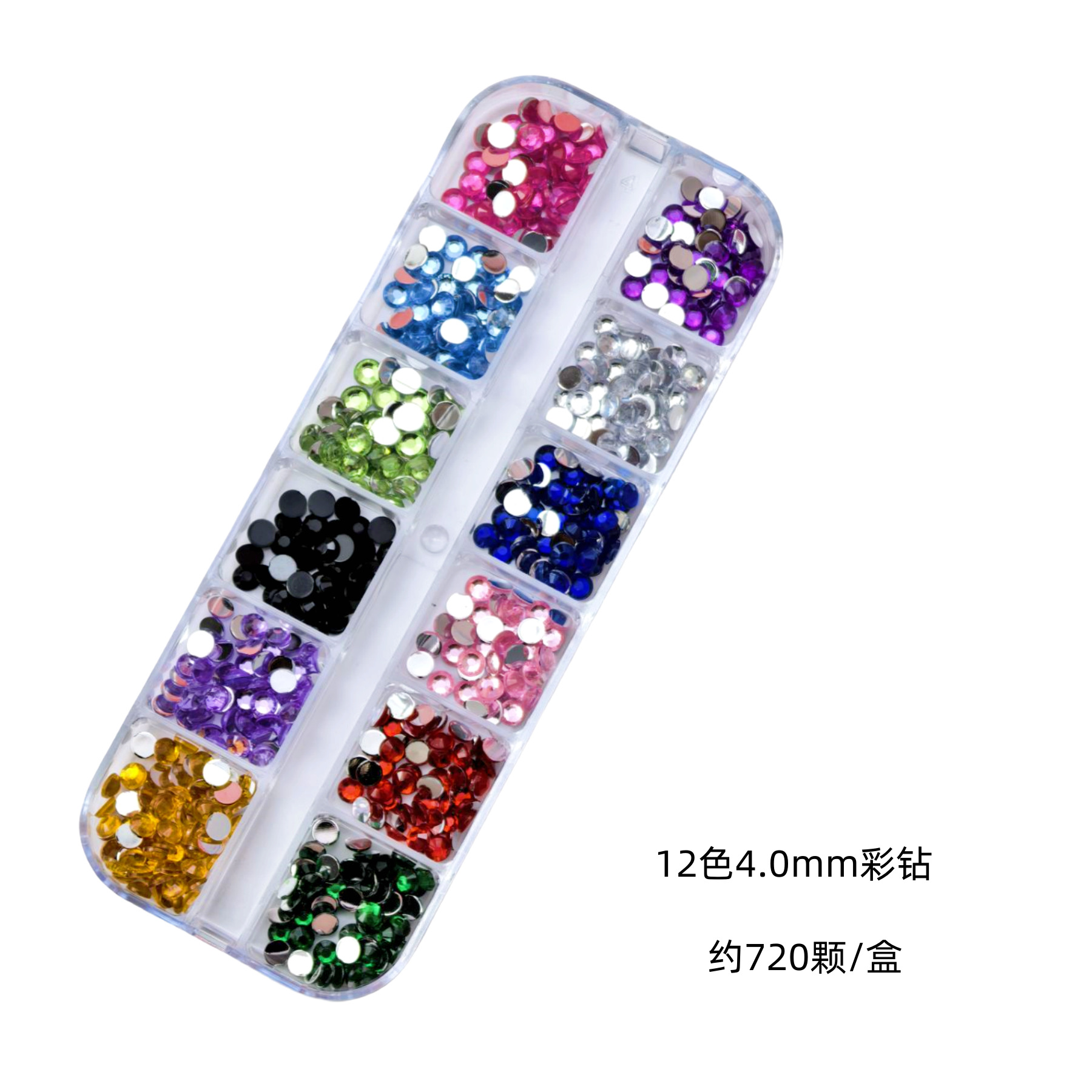 跨境美甲钻饰品12格盒美甲钻多尺寸混装钻彩色圆形平底钻盒装