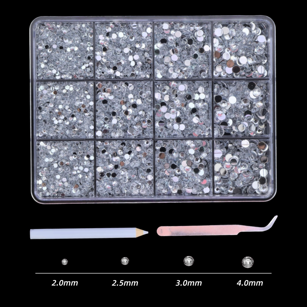 2025年クロスボーダー12グリッド箱入りネイルアートジュエリー、サイズ混合、スーパーフラッシュ平底ラウンドダイヤモンドネイルステッカージュエリー
