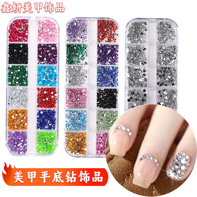 跨境12格盒装爆闪美甲钻混装彩色平底钻底树脂平底钻盒装饰品