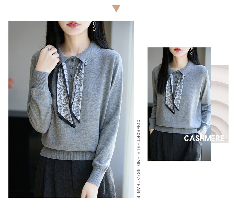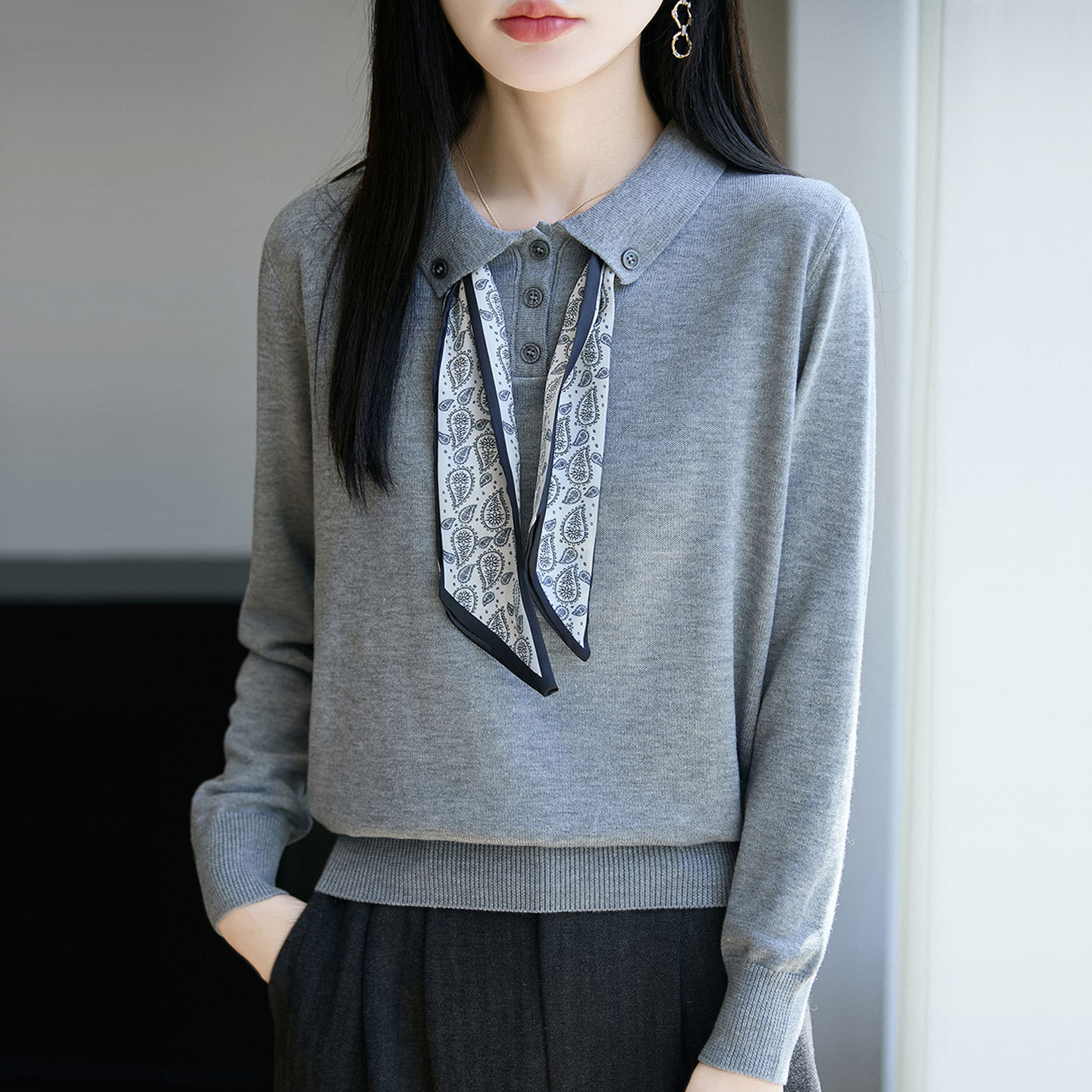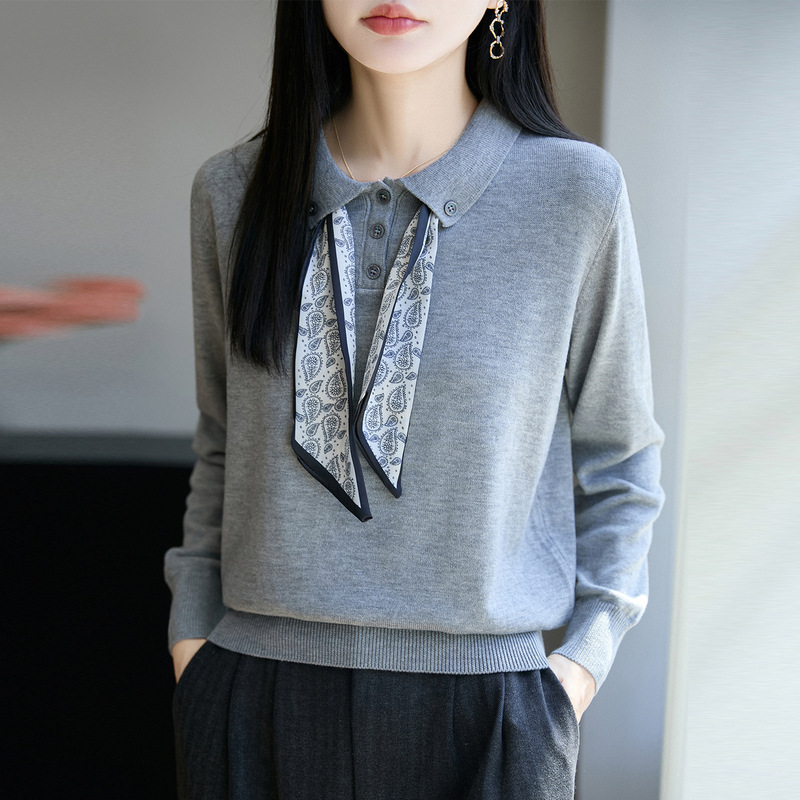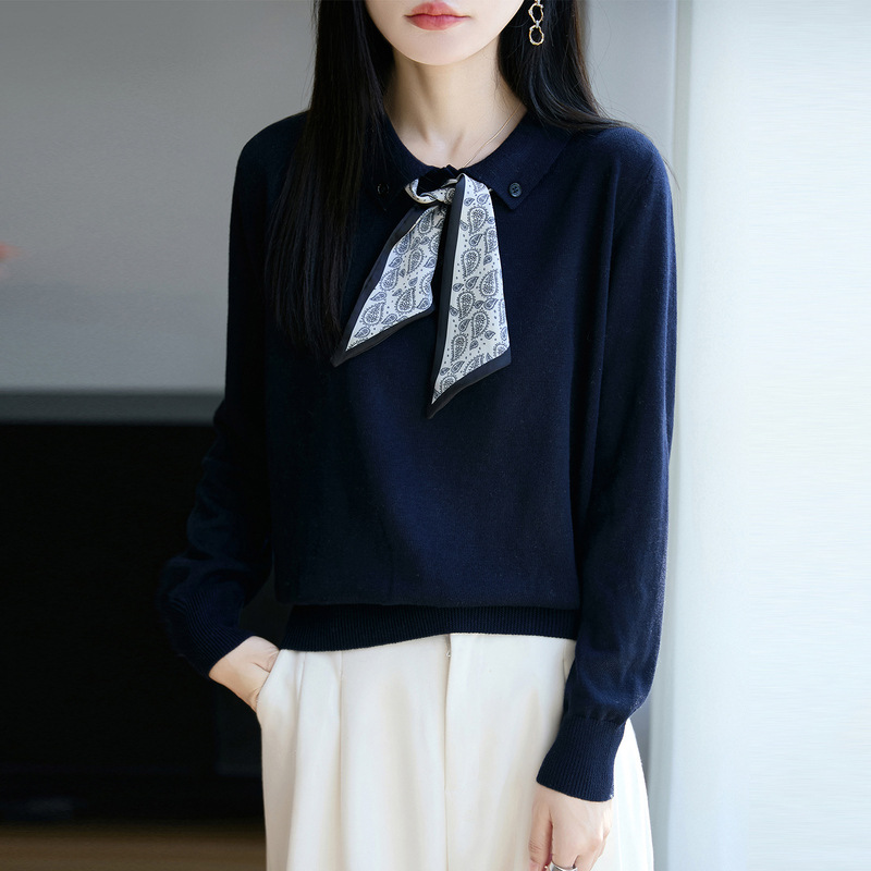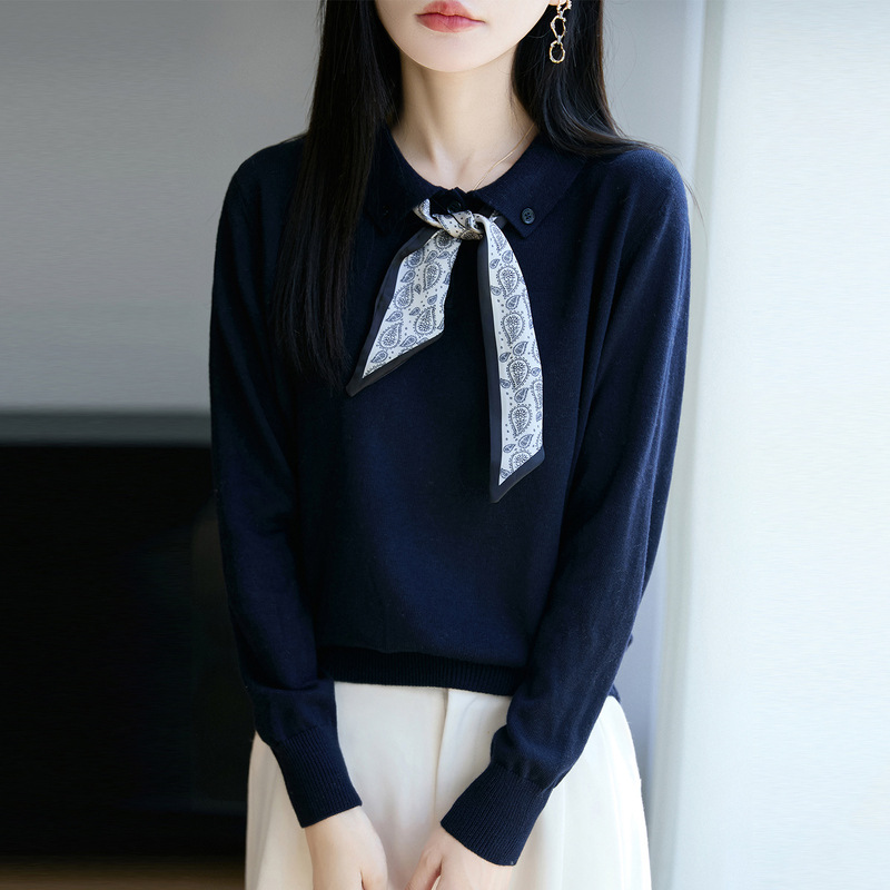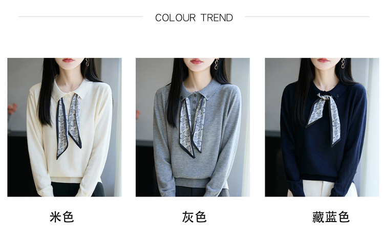【厂家直供】秋季新款翻领带丝巾打底上衣外穿宽松气质减龄针织衫
