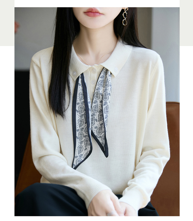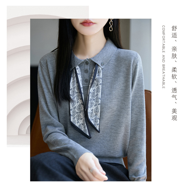 丝巾polo领衬衣长袖女2025秋季新款设计感羊毛针织衫气质上衣