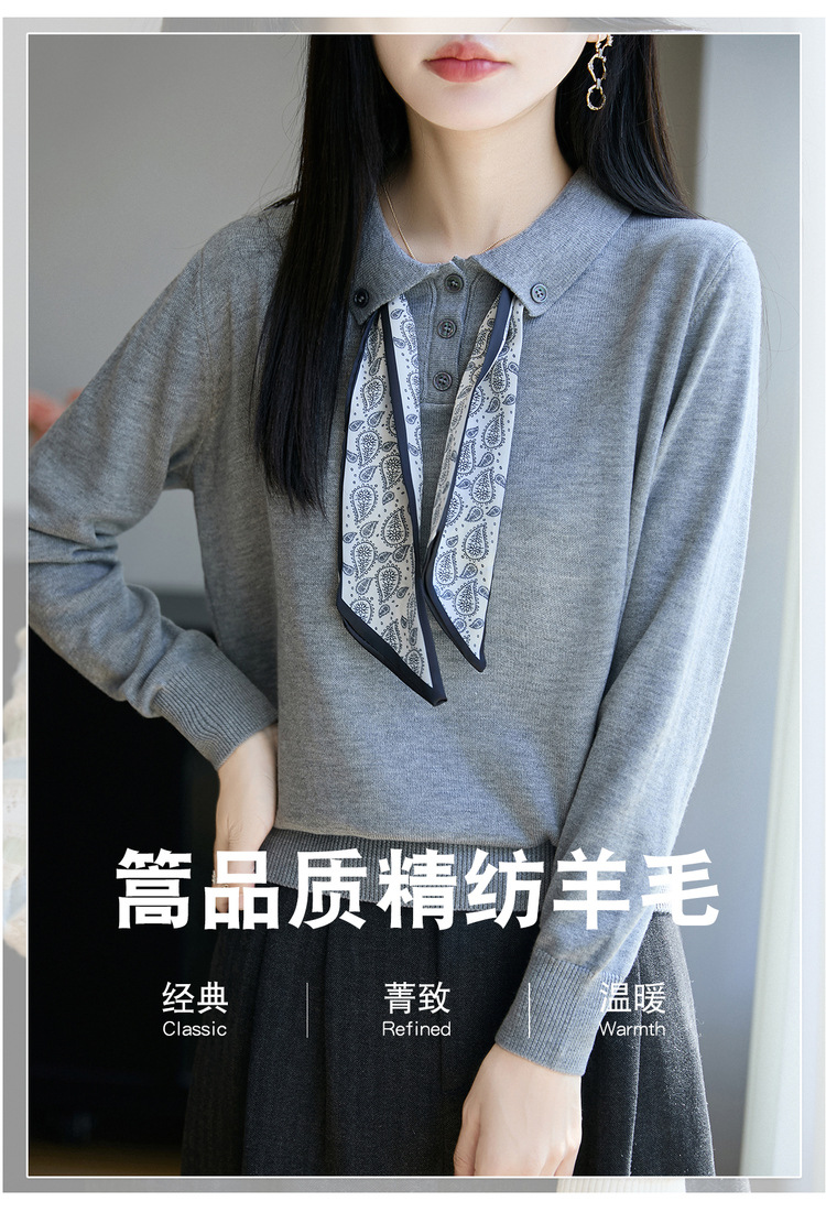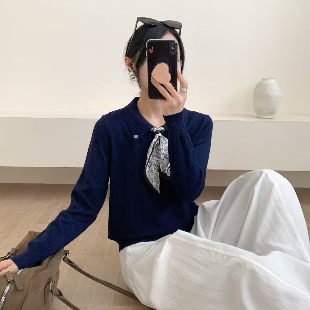 爆款丝巾polo领套头针织衫女秋季新款时尚气质纽扣翻领打底上衣