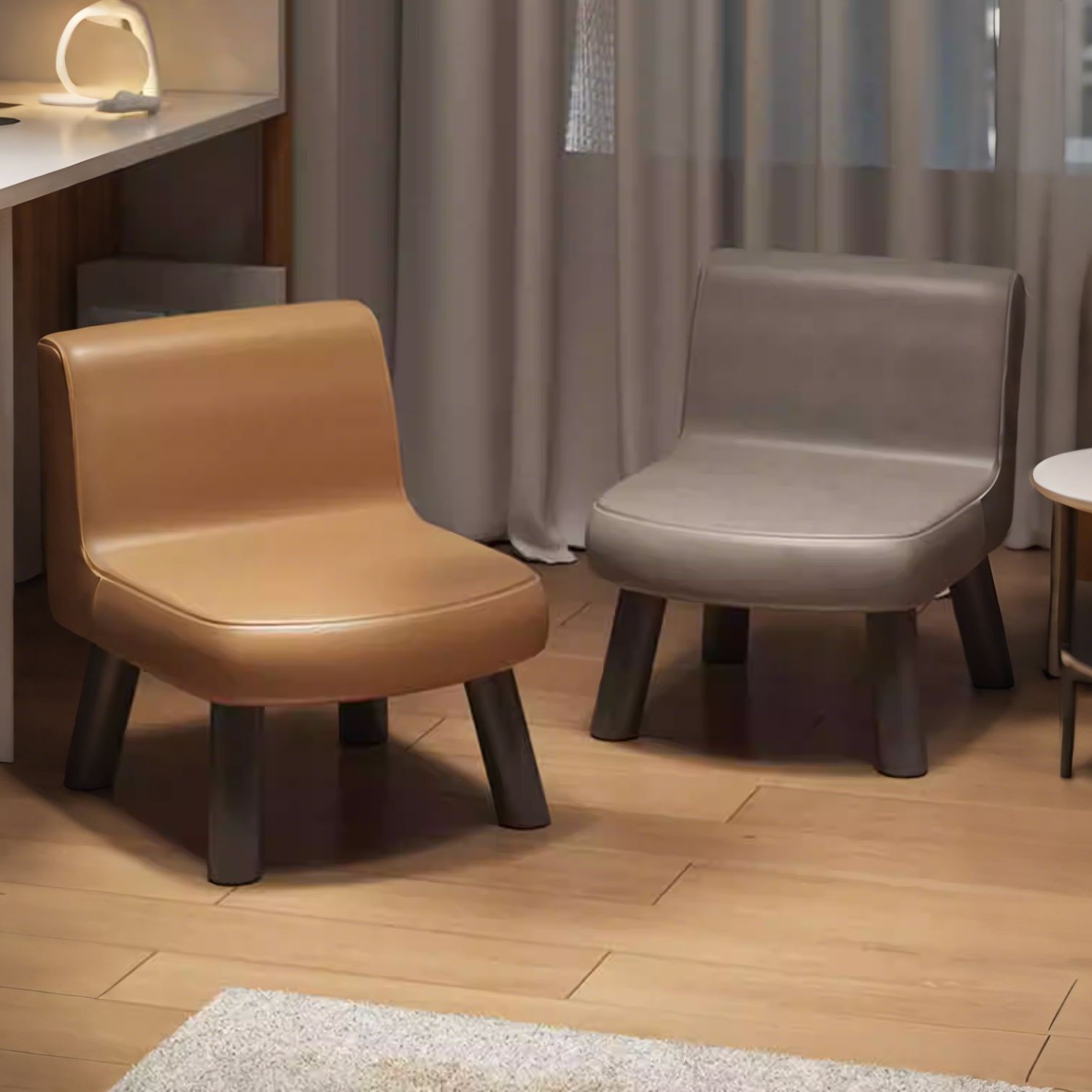 家庭用の小さい腰掛けは回転できます。背もたれの小さい椅子は低いです。
