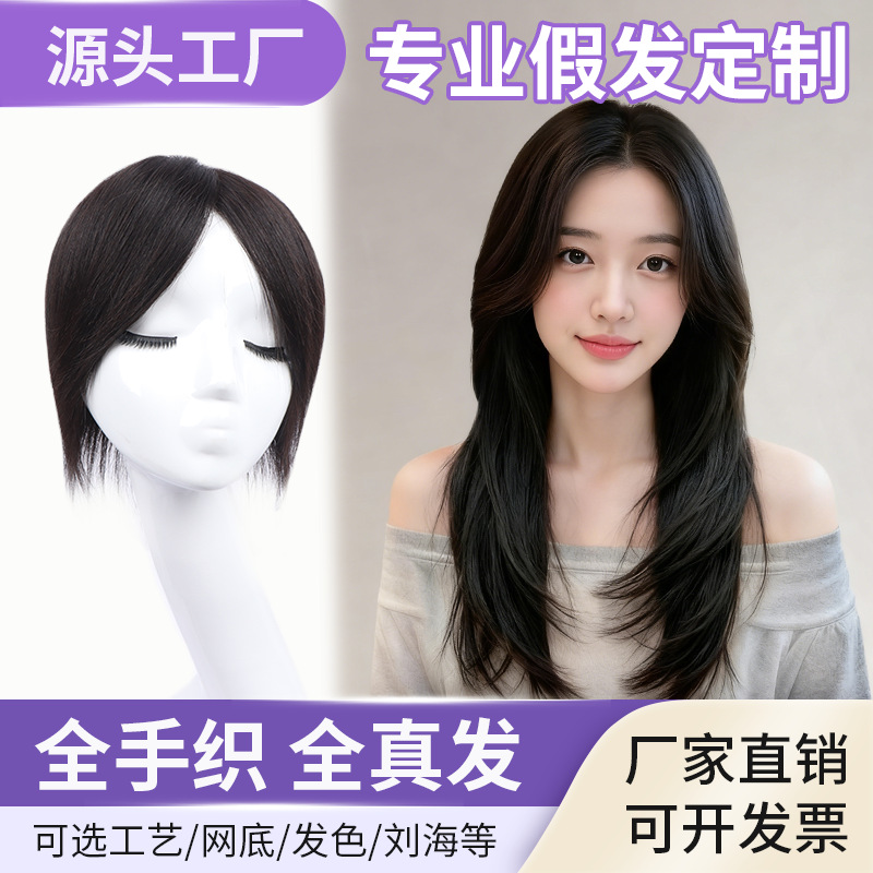 女性用ウィッグ 人毛ヘアピース バングス付き ノンマーキングヘアピース 増毛用 ダブルニードルトップヘアピース