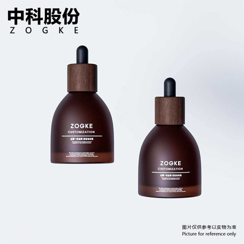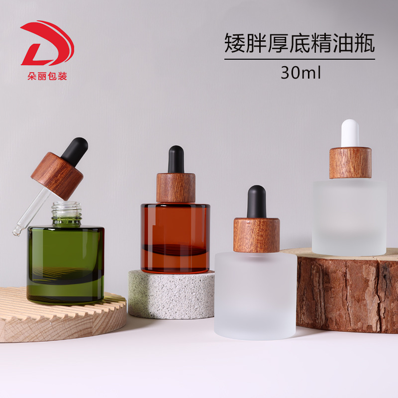 新款竹木盖玻璃精油瓶30ml厚底透明磨砂滴管瓶茶色绿色避光精华瓶