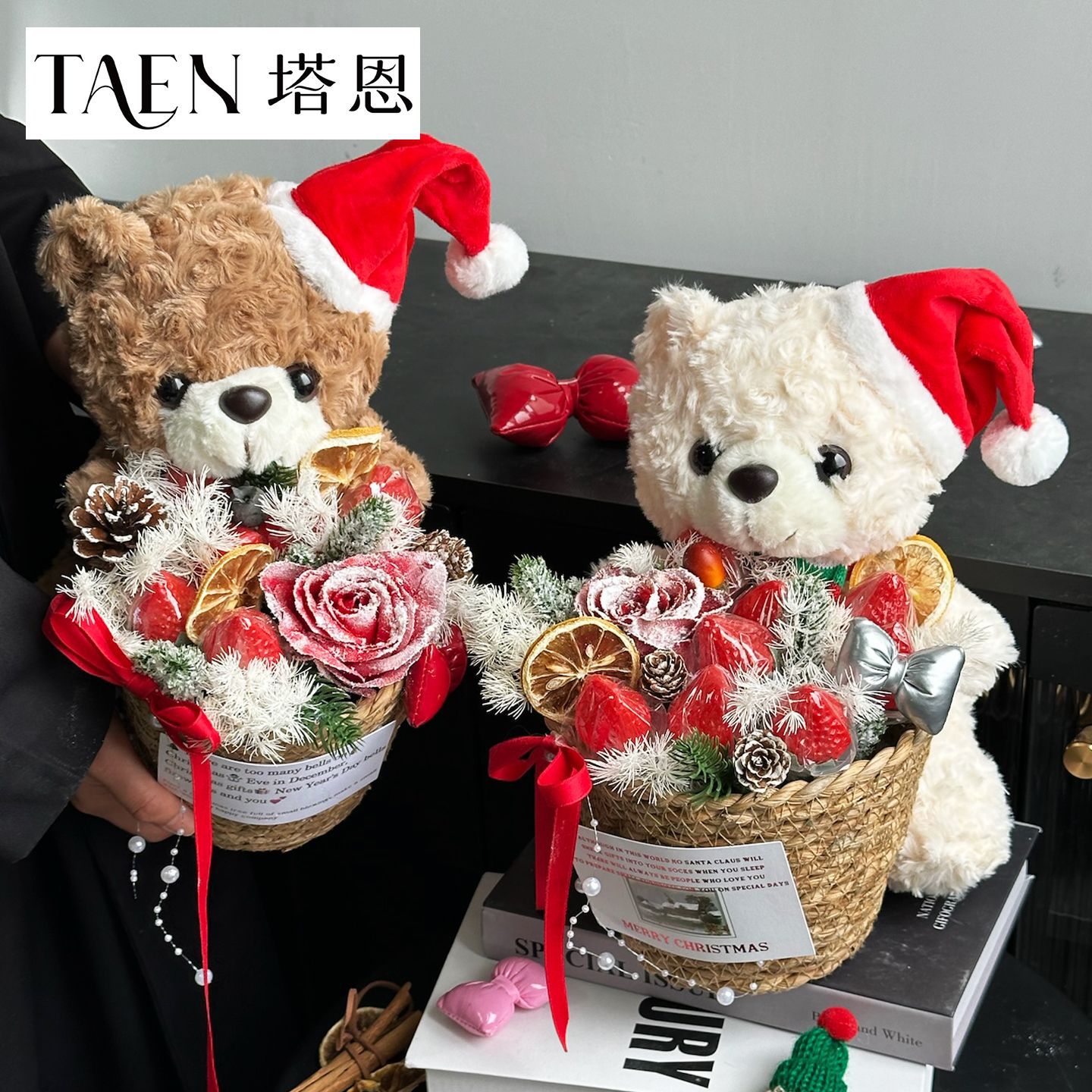 圣诞节抱抱桶毛绒小熊草编篮子花束鲜花包装花篮礼物圣诞装饰diy