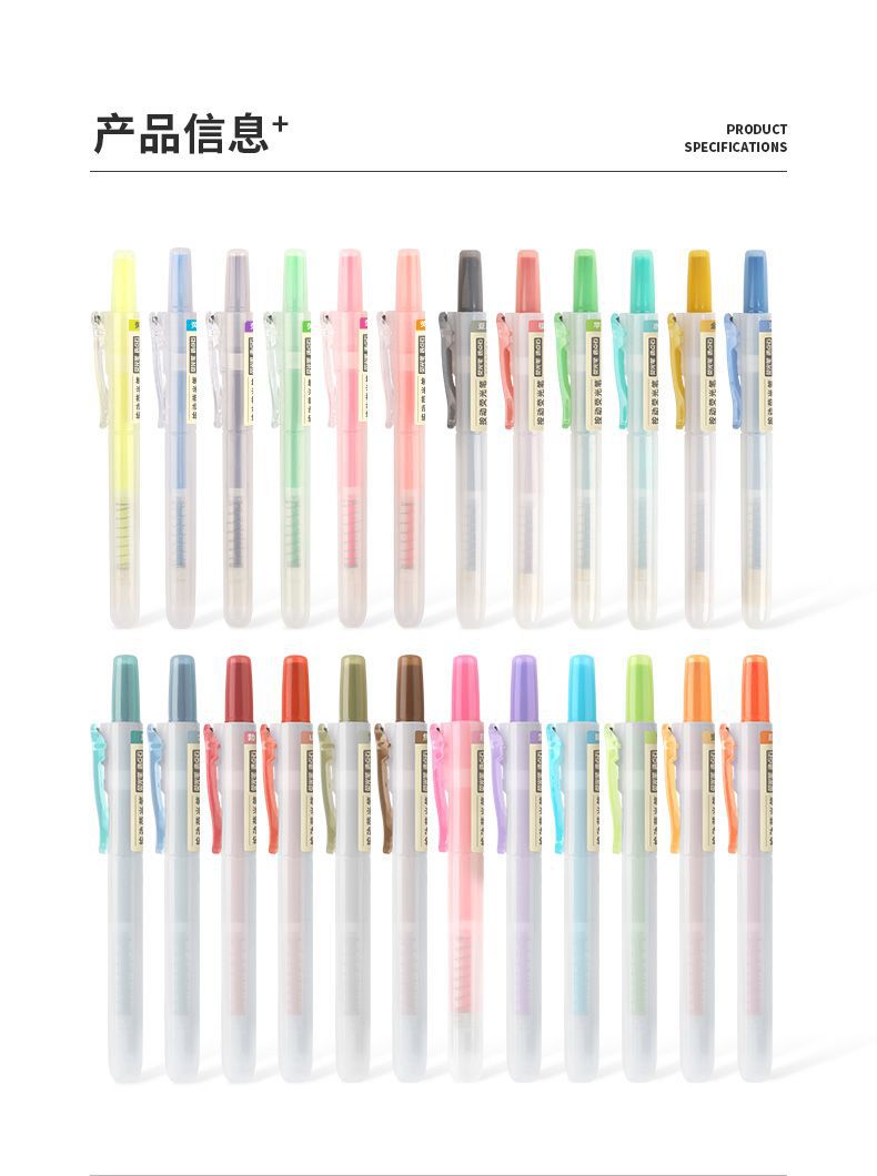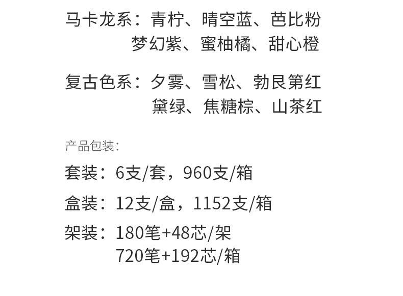 笔芯颜色 单支【荧光绿】,单支【荧光蓝】,单支【荧光粉】,单支【荧光紫】,单支【荧光橙】,单支【荧光黄】,单支【亚麻灰】,单支【深蓝】,单支【水蓝】,单支【苹果绿】,单支【金黄】,单支【樱红】,单支【焦糖棕】,单支【雪松】,单支【山茶红】,单支【勃艮第红】,单支【夕雾】,单支【黛绿】,单支【甜心橙】,单支【蜜柚橘】,单支【青柠】,单支【睛空蓝】,单支【梦幻紫】,单支【芭比粉】