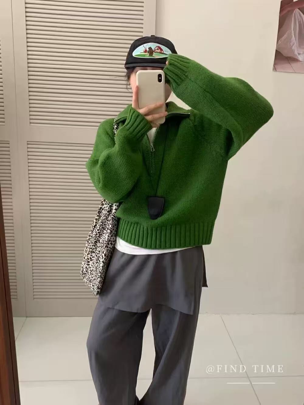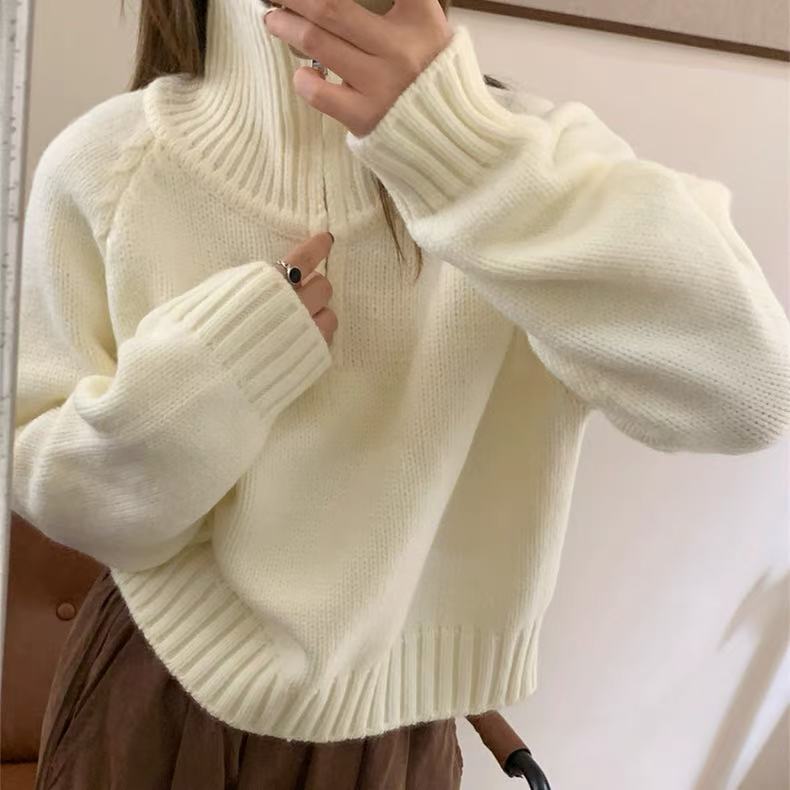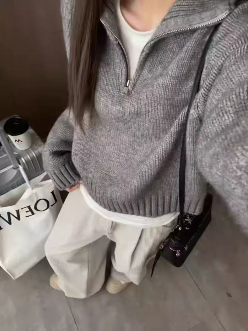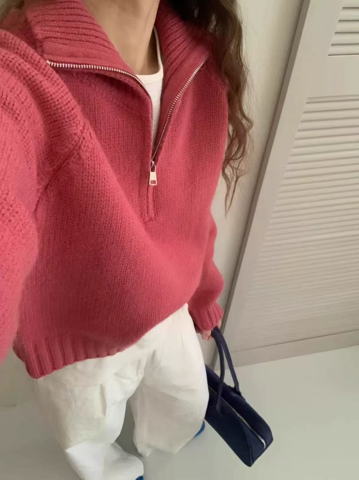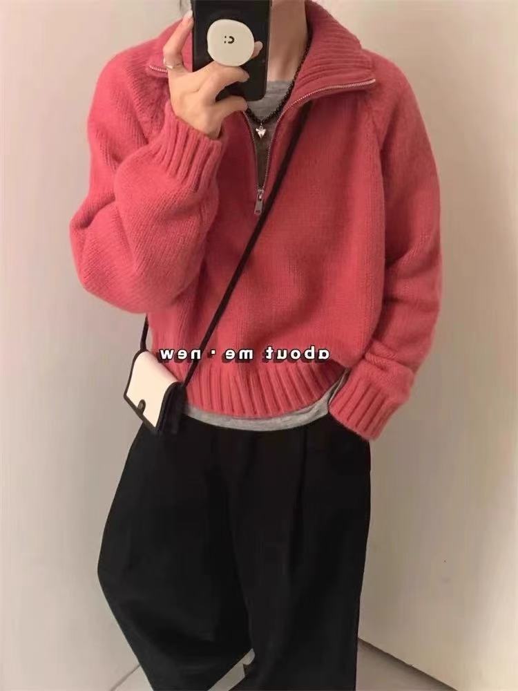 25小众设计感半拉链翻领毛衣女上衣显瘦慵懒风宽松高领针织羊毛衫