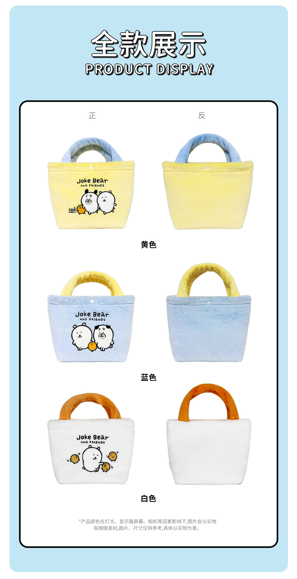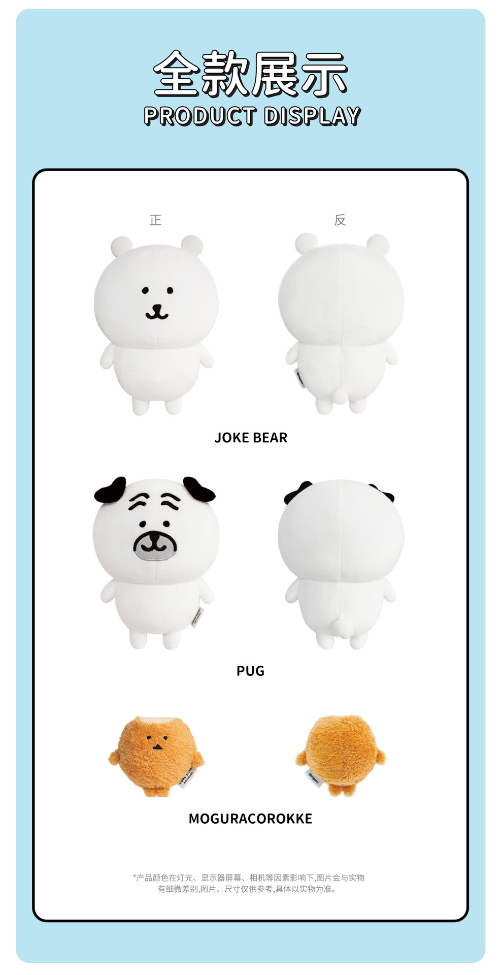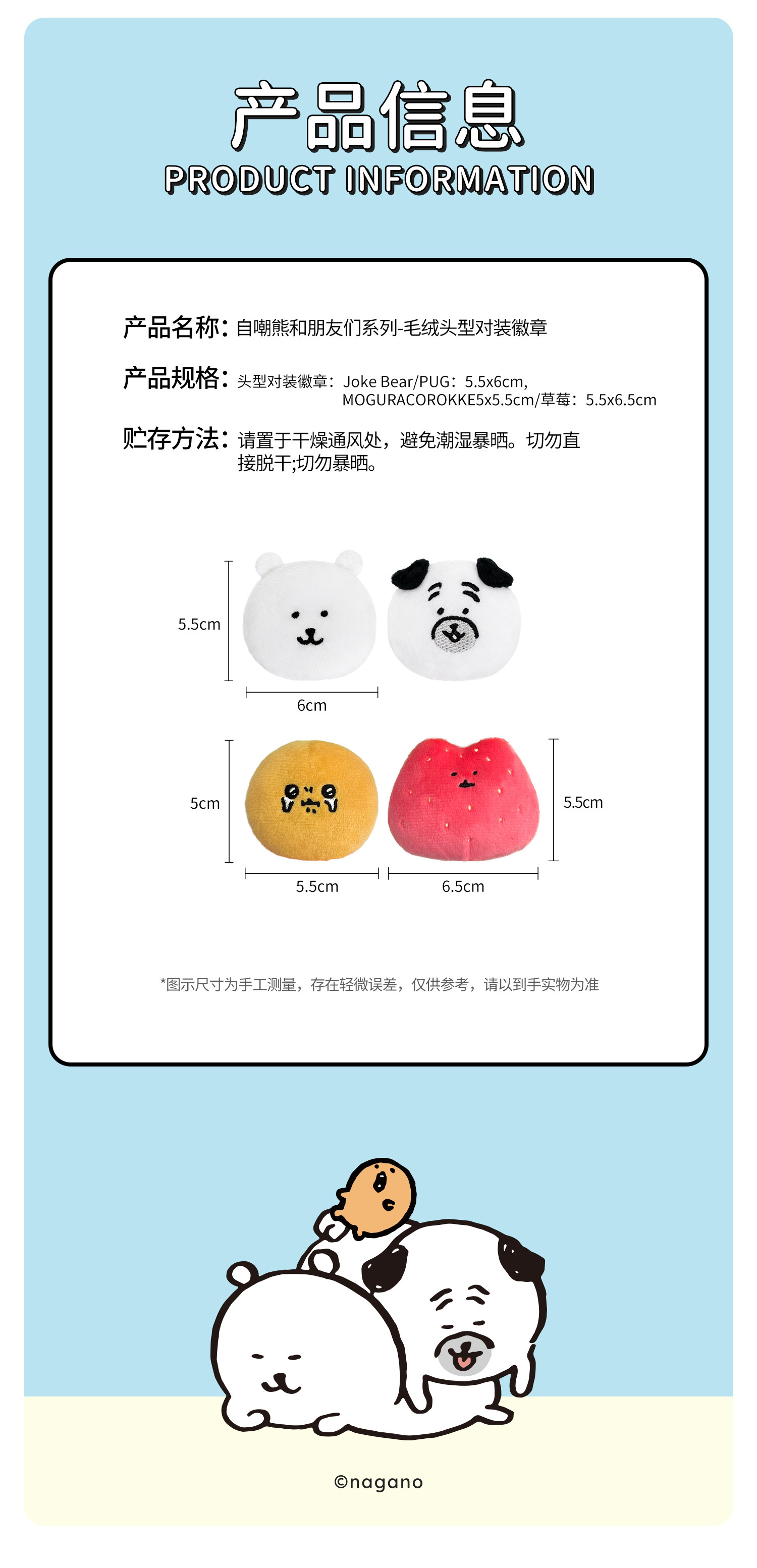 颜色 站姿徽章-帕格9*7cm,站姿徽章-鼹鼠7.5*8cm,趴姿徽章-帕格6.5*8cm,对装徽章-草莓鼹鼠6cm,对装徽章-丘帕6.5cm,帕格公仔20*15cm,自嘲熊双肩包24*32cm,鼹鼠双肩包24*32cm,帕格双肩包24*32cm,帕格水桶包24*22cm,自嘲熊手提包28*22cm,鼹鼠手提包28*22cm,帕格手提包28*22cm