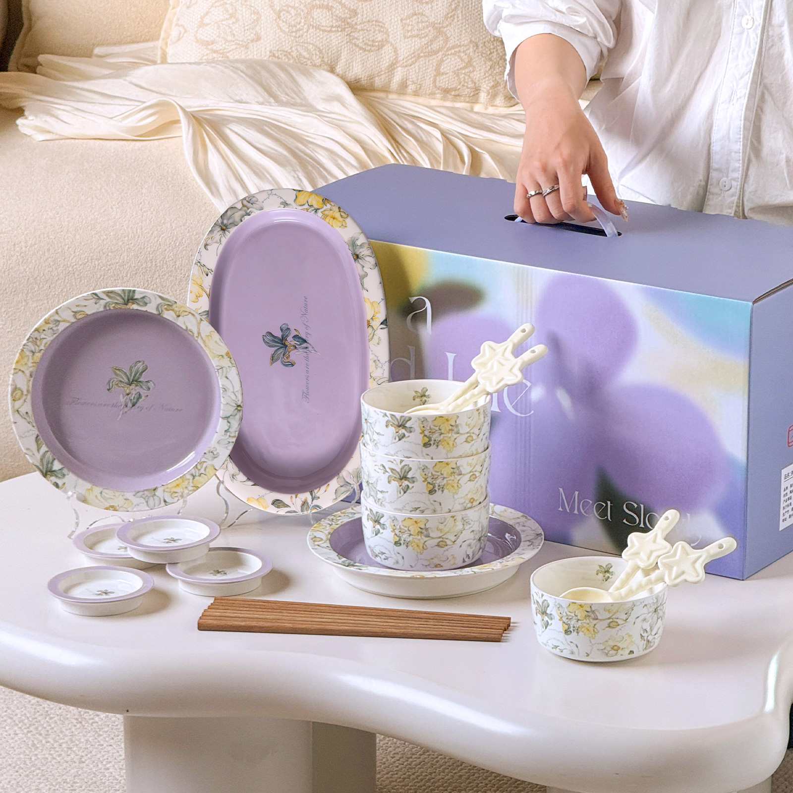 紫色のアイリスの花の高価値のボウルとプレートホリデーお土産セット家庭用セラミック食器新築祝いホリデーギフト