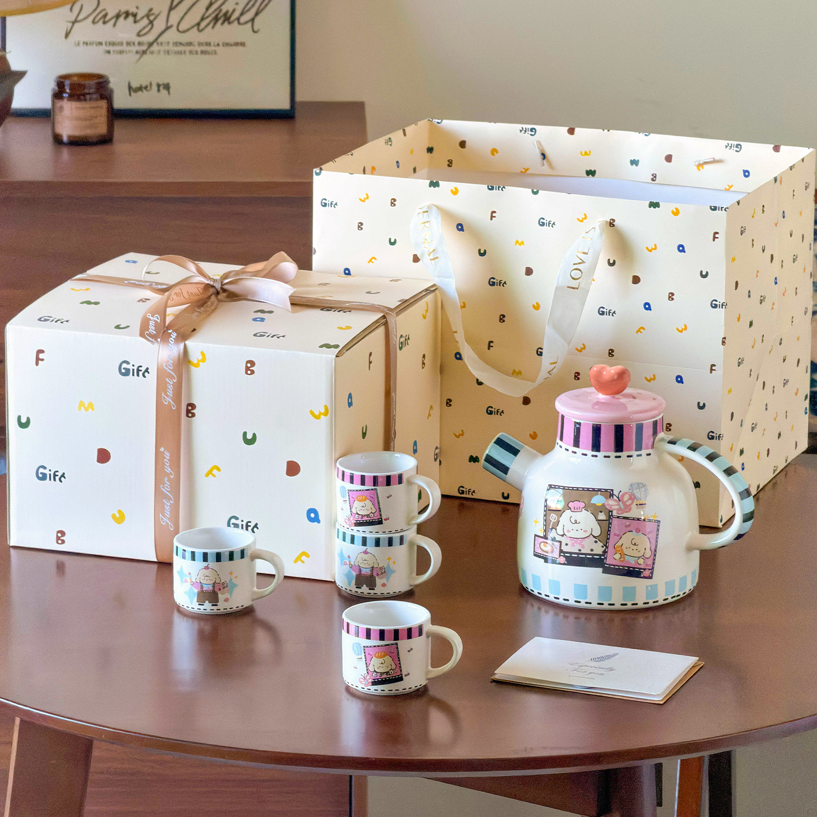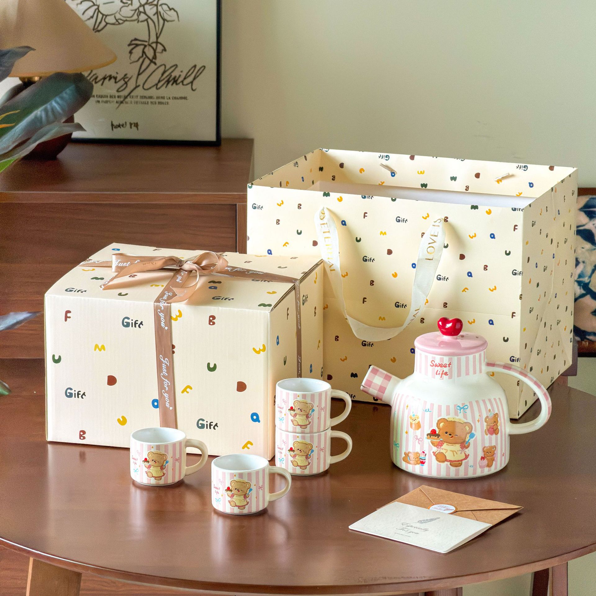 格子黄油小熊陶瓷水壶水杯礼袋套装高颜值恒温花茶壶礼物可爱礼盒