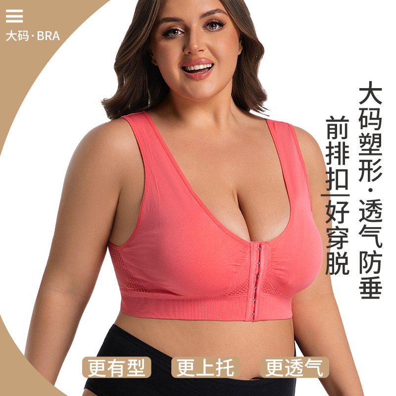 クロスボーダーの人気透かし彫りメッシュ通気性下着女性プラスサイズスチールリングなしフロントバックルブラジャー薄いスポーツヨガ
