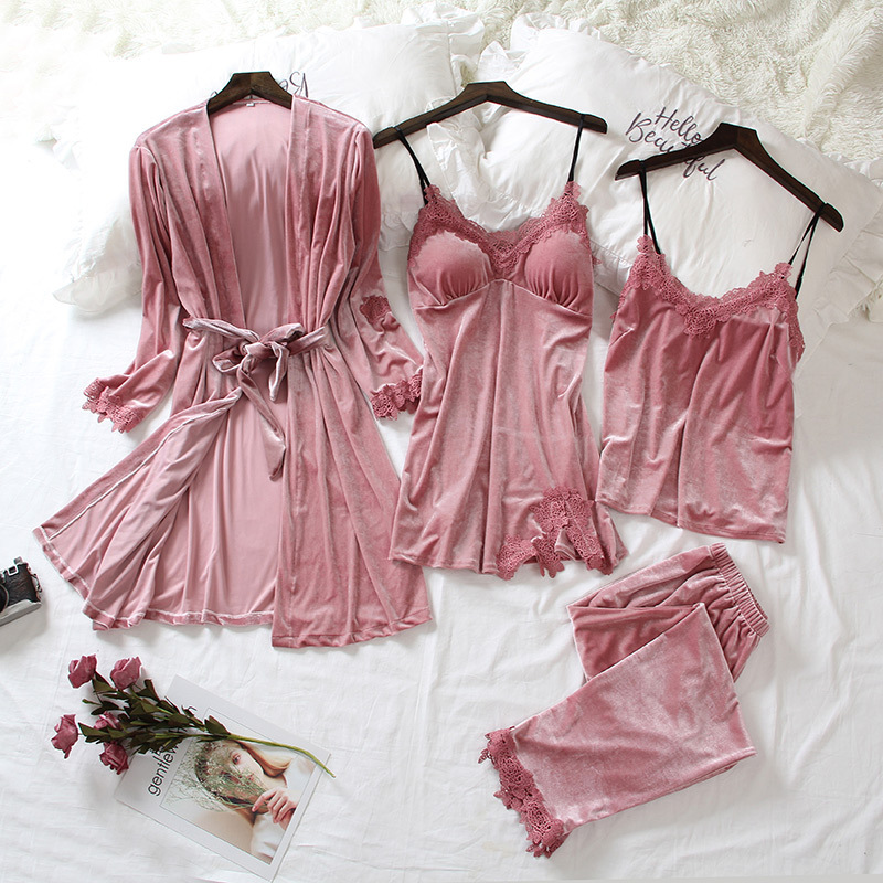 パジャマの女性の秋冬の金のベルベットの4つのセットの寝衣のパジャマのスーツの長袖のズボンの韓国版は胸のパッドの家の服を持ちます。
