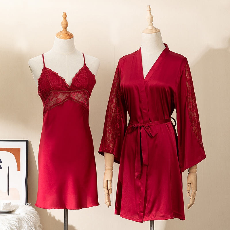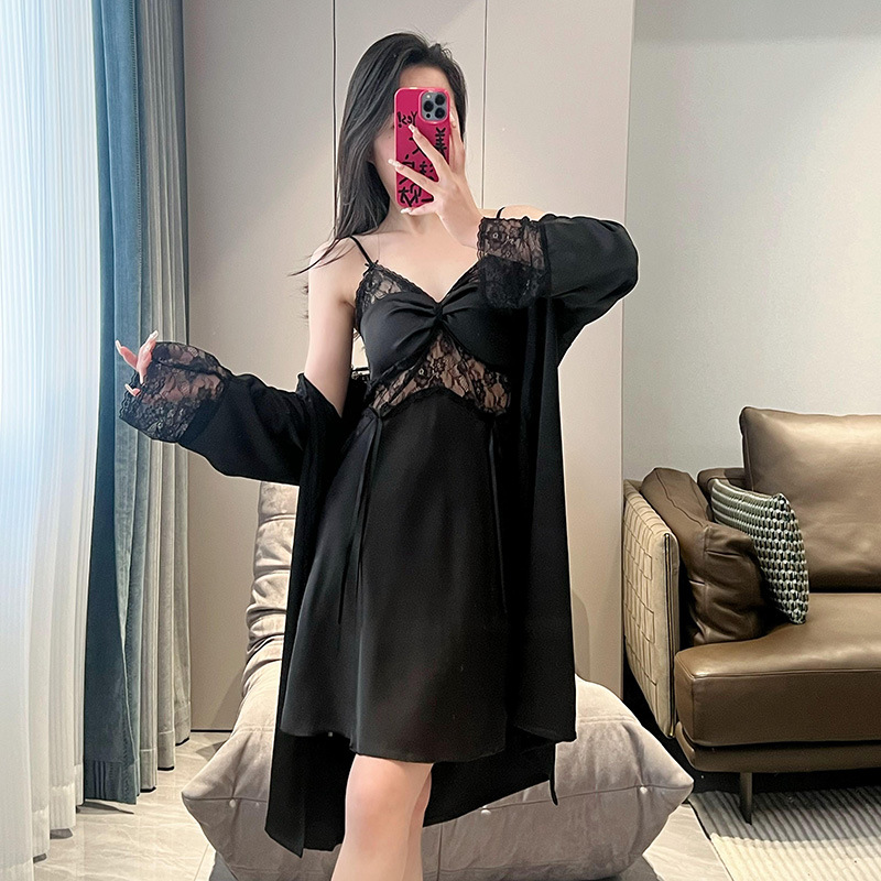 純欲風寝スカート女性春夏氷シルクストラップ胸当てスカート長袖パジャマ2点セットセクシーパジャマ