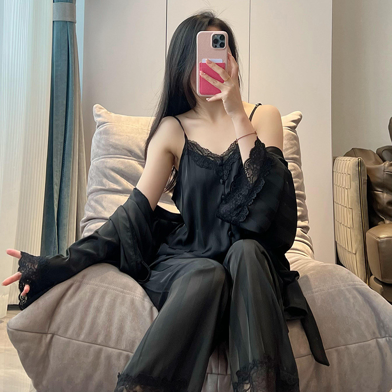 カシミヤのパジャマ女性2023年秋冬の新型長袖長ズボンセットレースのカーディガンの家庭服は外着ができます。